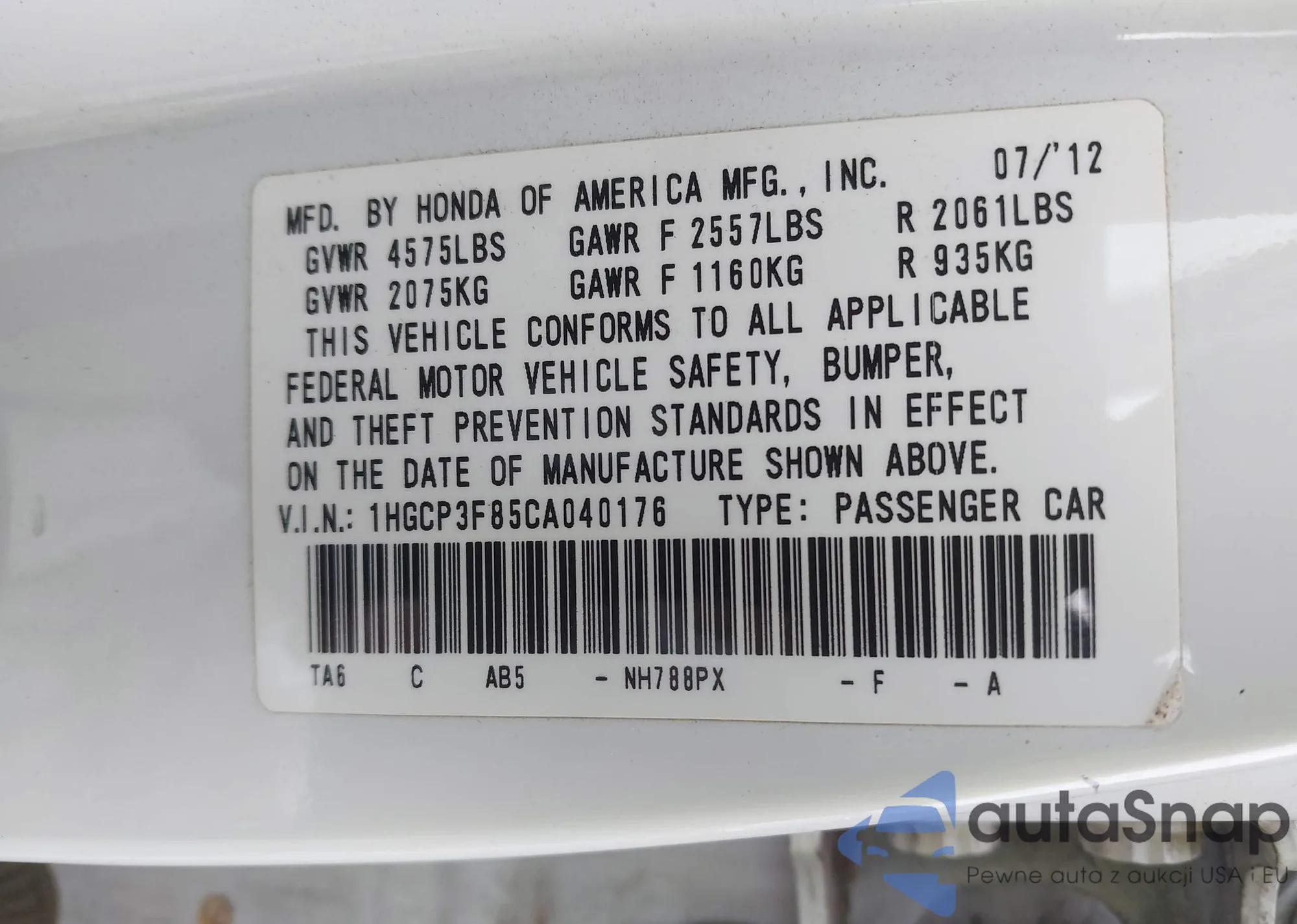 • VIN: 1HGCP3F85CA040176