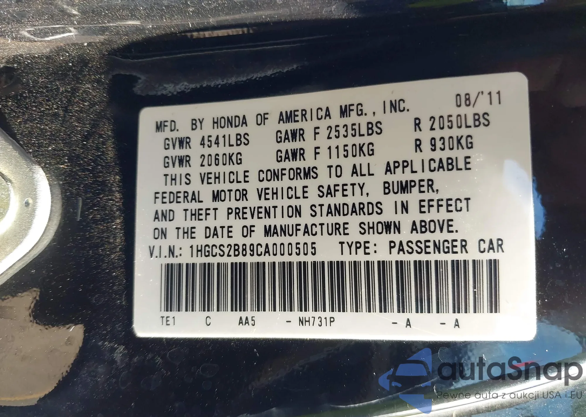 VIN: 1HGCS2B89CA000505