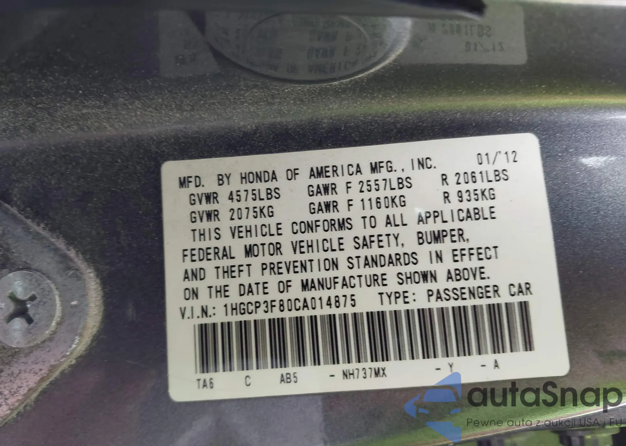 Автомобиль Honda Accord 2012 (VIN 1HGCP3F80CA014875) ранее не участвовал в торгах. Документы чистые, пробег соответствует или ниже среднего по рынку. Продаётся страховой компанией — рекомендуем покупку. Доставка в порт займет около 6–8 недель.