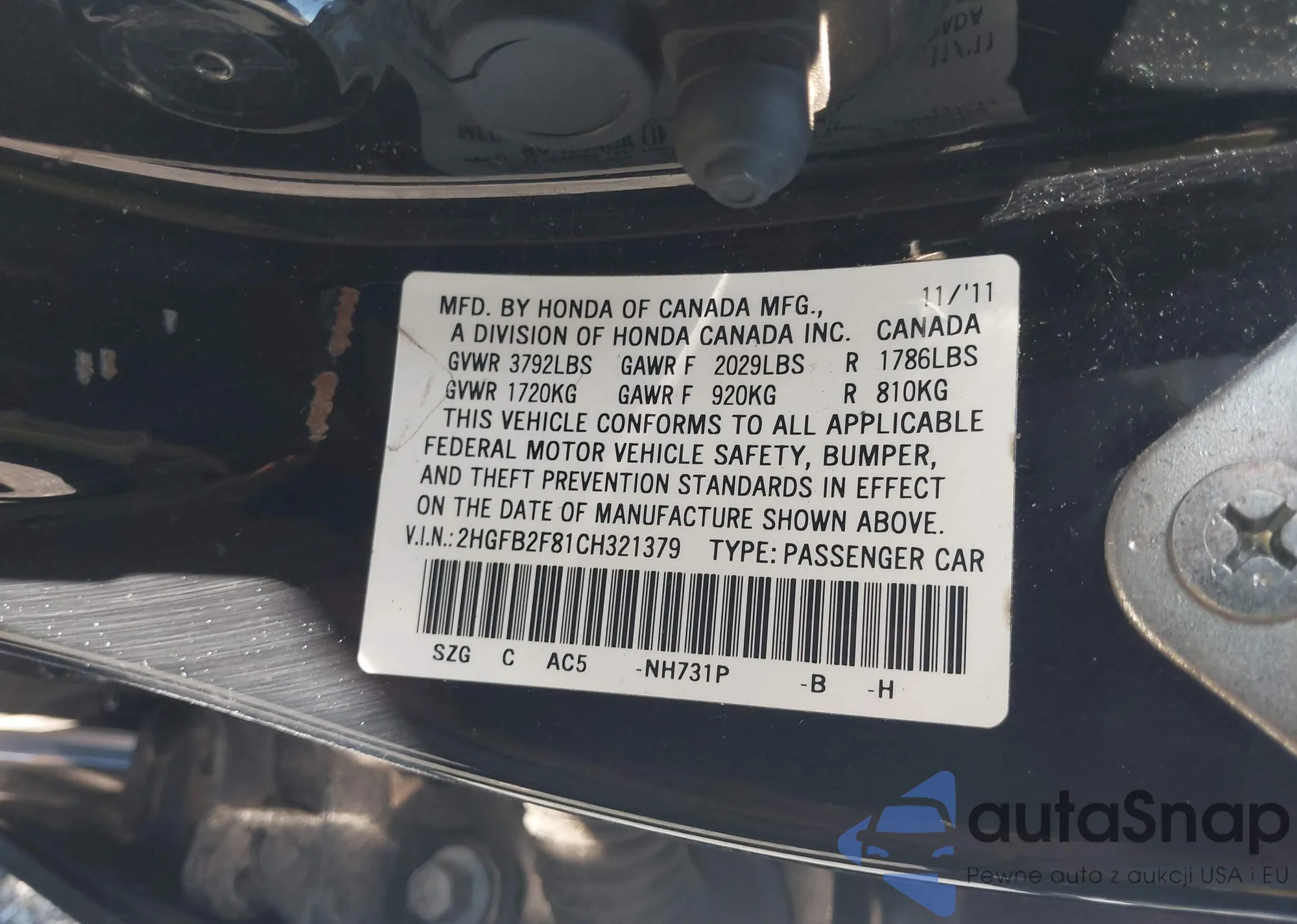 VIN: 2HGFB2F81CH321379