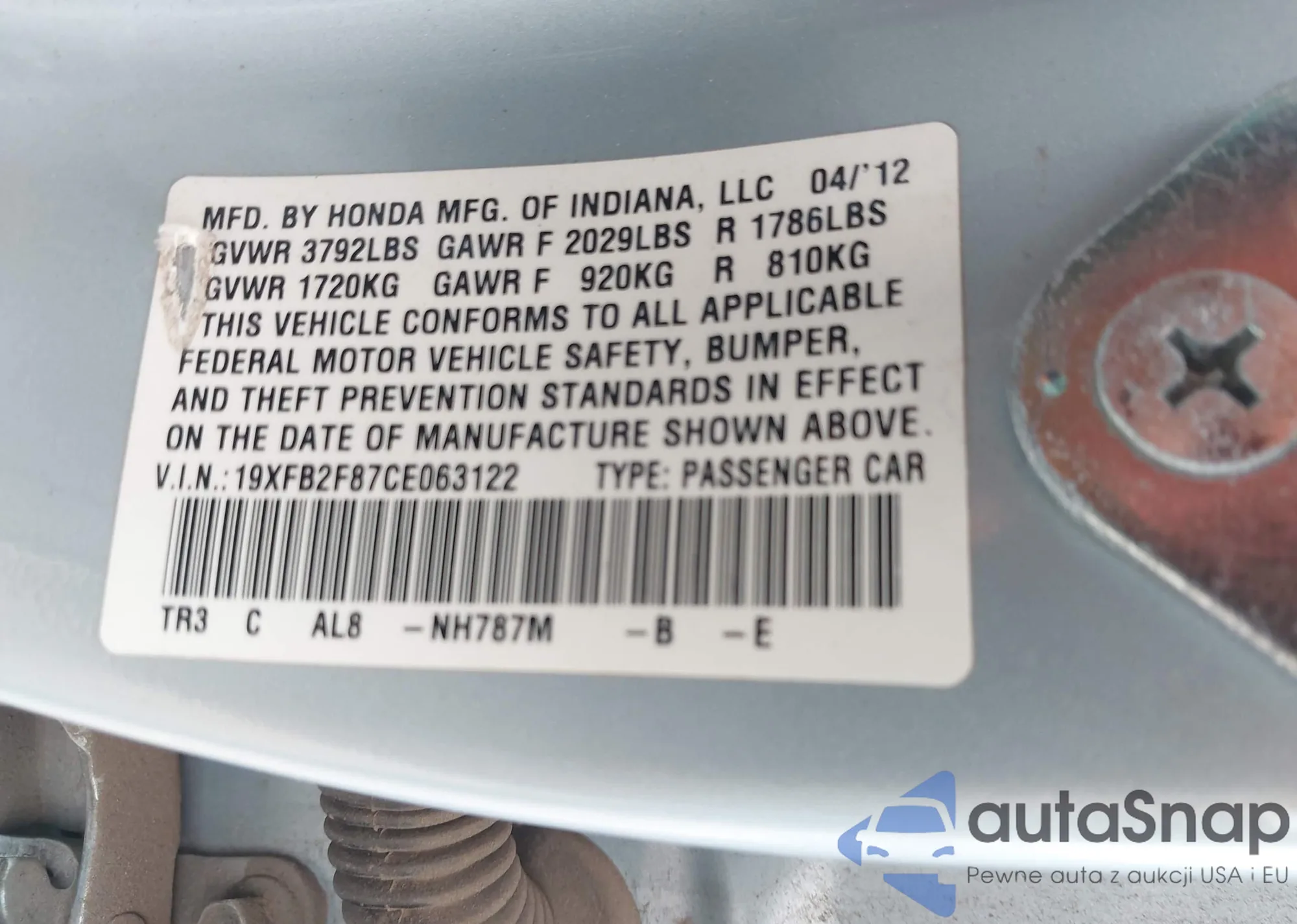 Автомобиль Honda Civic 2012 (VIN 19XFB2F87CE063122) имеет документы, препятствующие регистрации. Могут возникнуть сложности при экспорте и регистрации. Обратитесь к экспертам AutaSnap для поиска альтернатив.