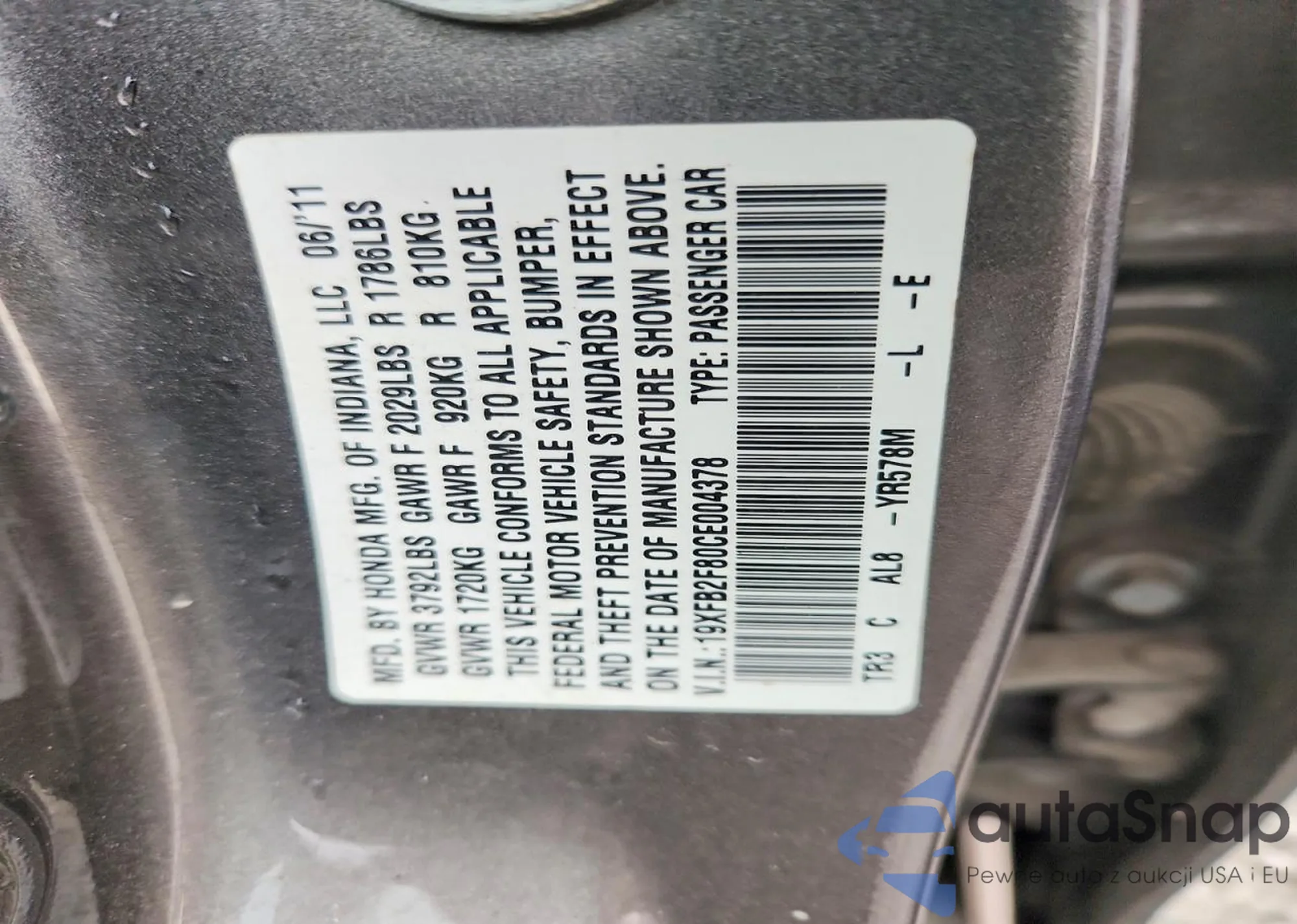 Автомобиль Honda Civic 2012 (VIN 19XFB2F80CE004378) ранее не участвовал в торгах. Документы чистые, пробег соответствует или ниже среднего по рынку. Продаётся страховой компанией — рекомендуем покупку. Доставка в порт займет около 6–8 недель.