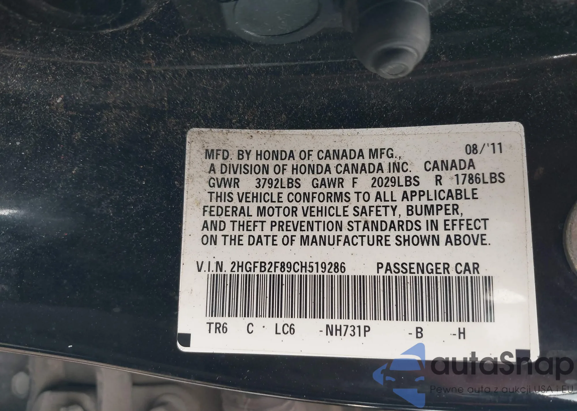 VIN: 2HGFB2F89CH519286