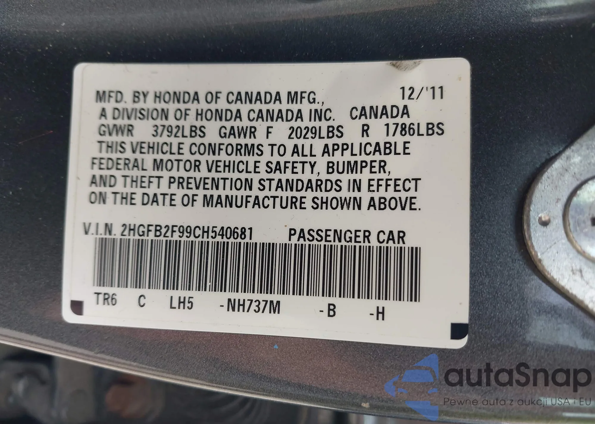 VIN: 2HGFB2F99CH540681