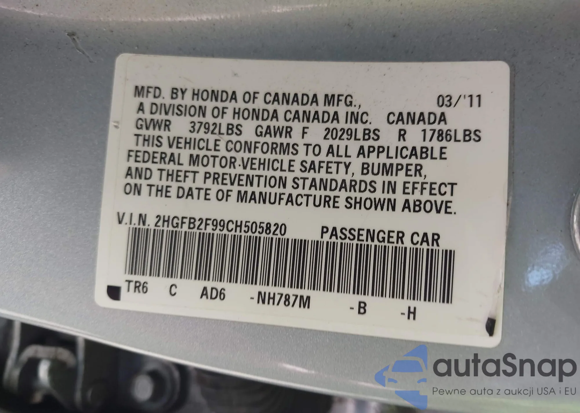 VIN: 2HGFB2F99CH505820