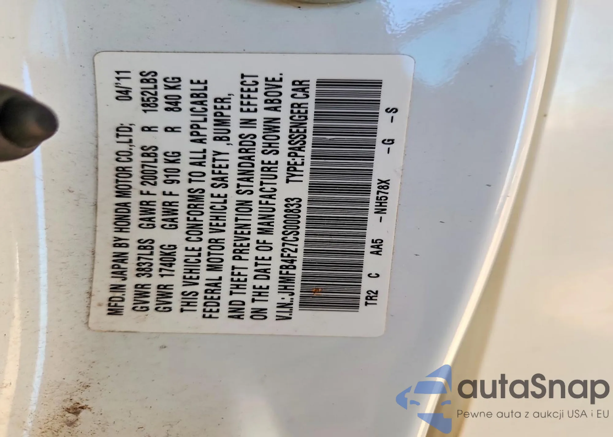 VIN: JHMFB4F27CS000833
