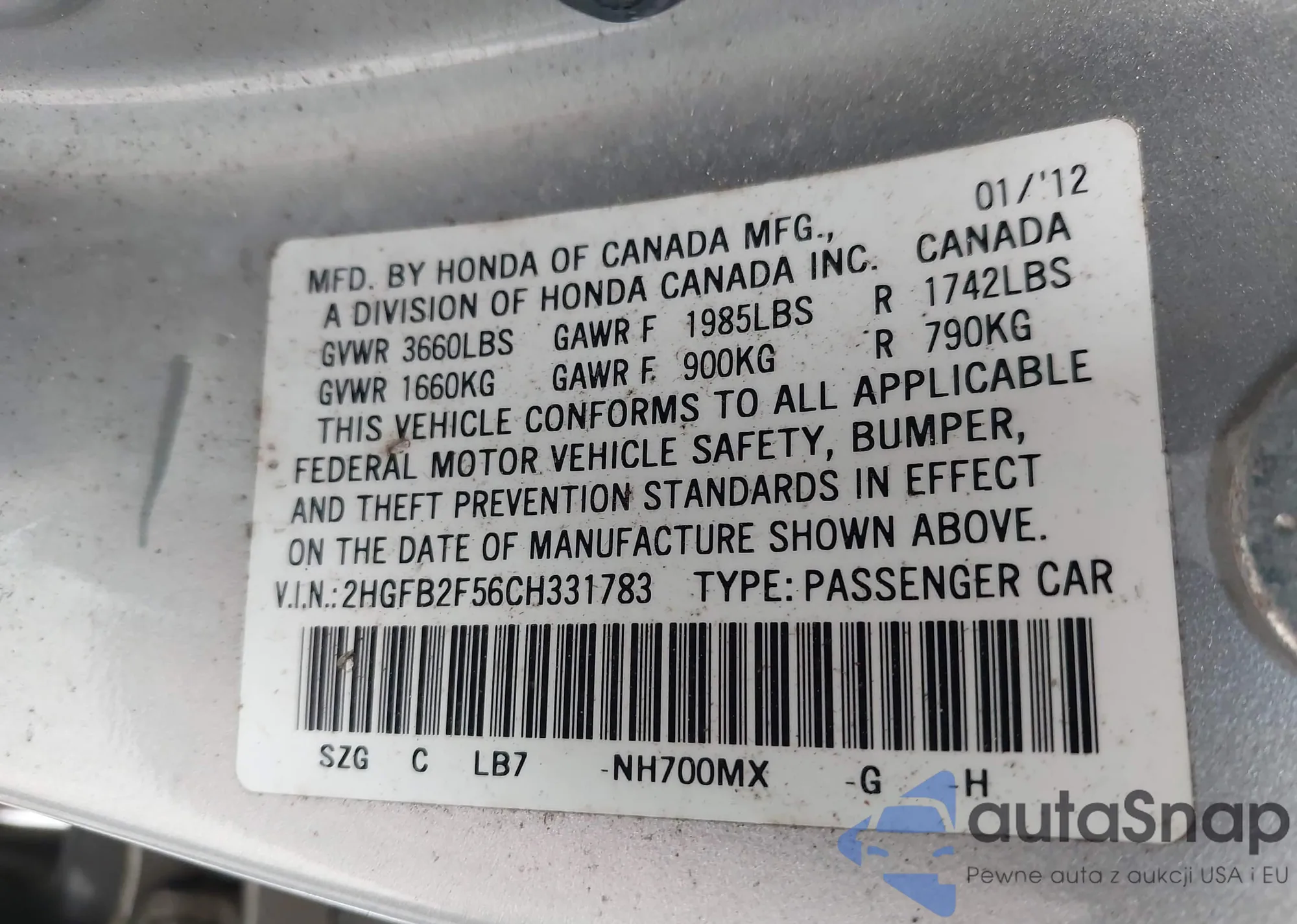 VIN: 2HGFB2F56CH331783
