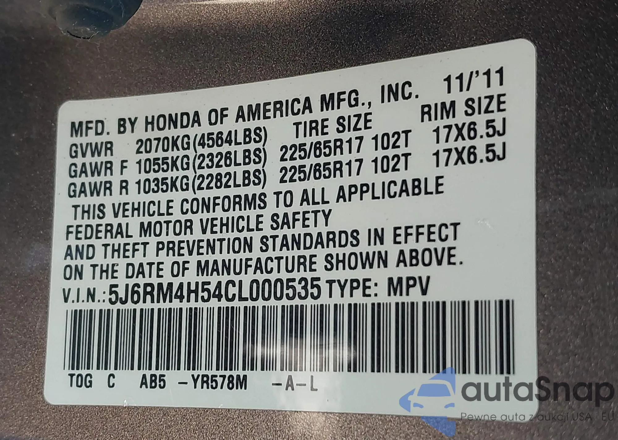 VIN: 5J6RM4H54CL000535