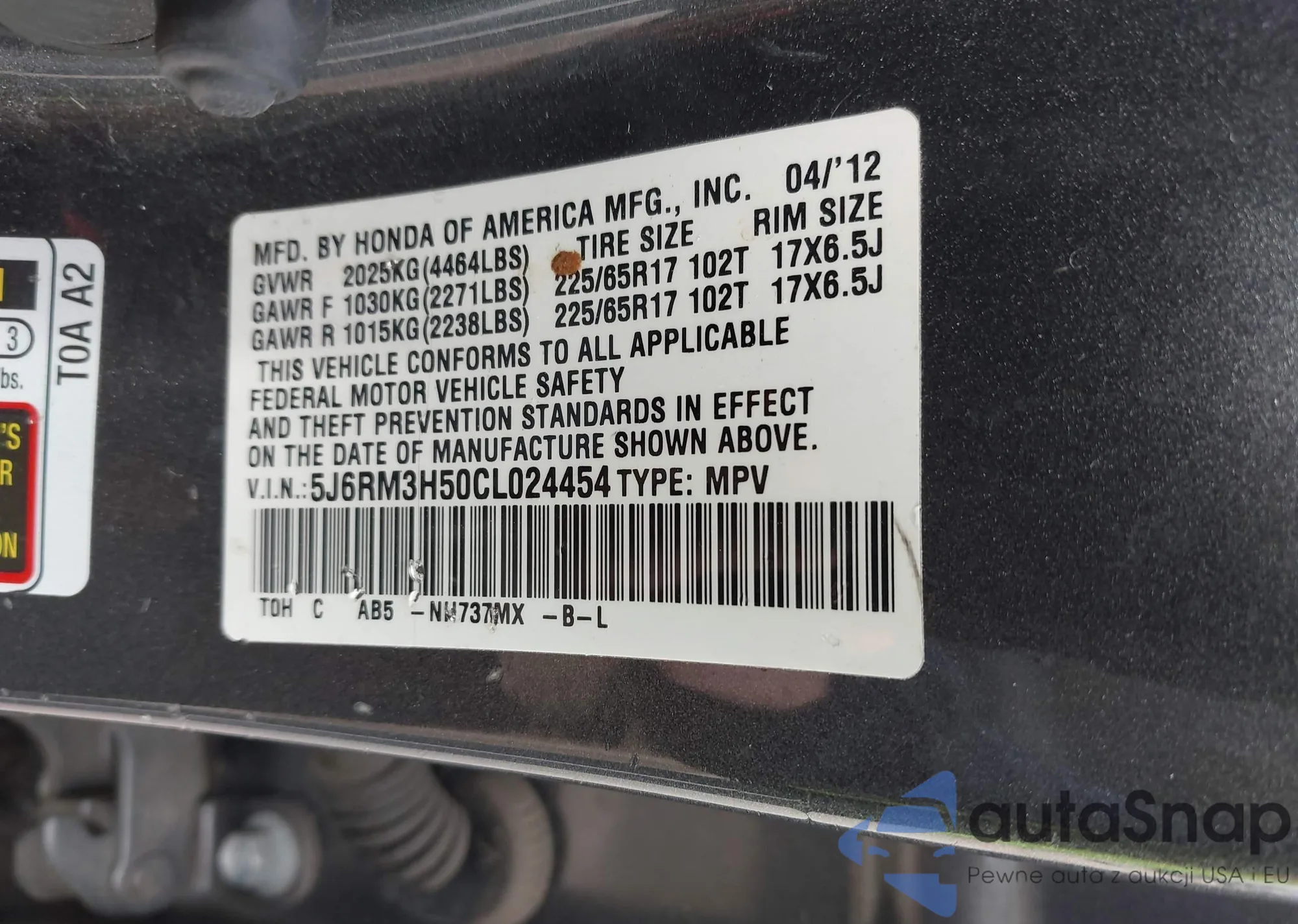VIN: 5J6RM3H50CL024454