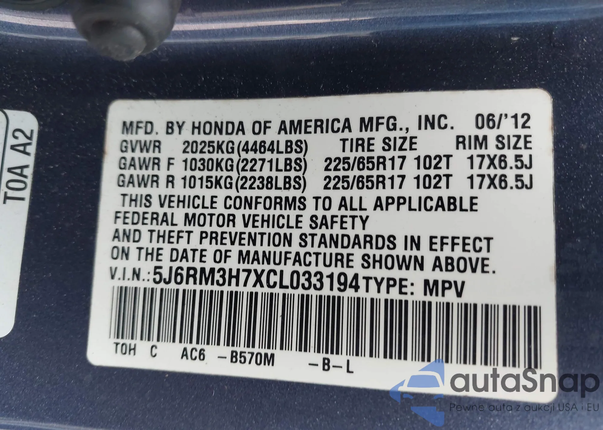 VIN: 5J6RM3H7XCL033194