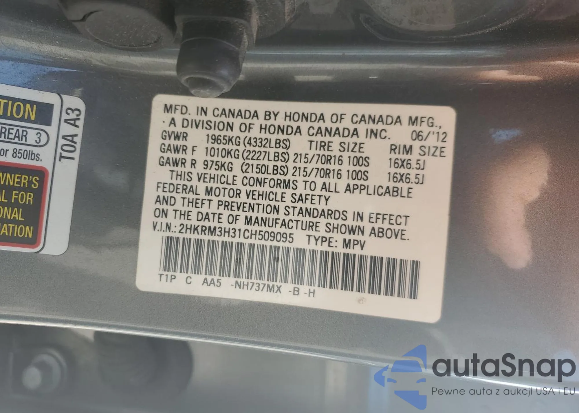 VIN: 2HKRM3H31CH509095