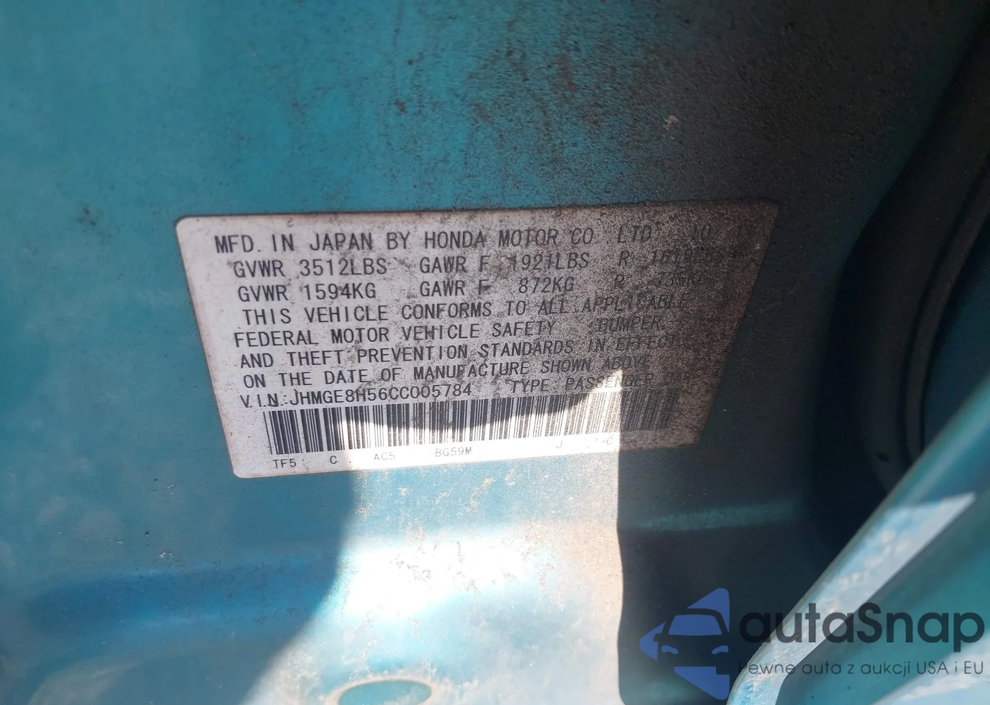 VIN: JHMGE8H56CC005784