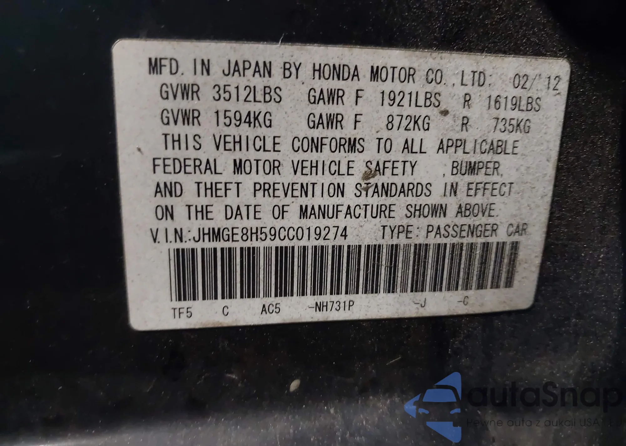• VIN: JHMGE8H59CC019274