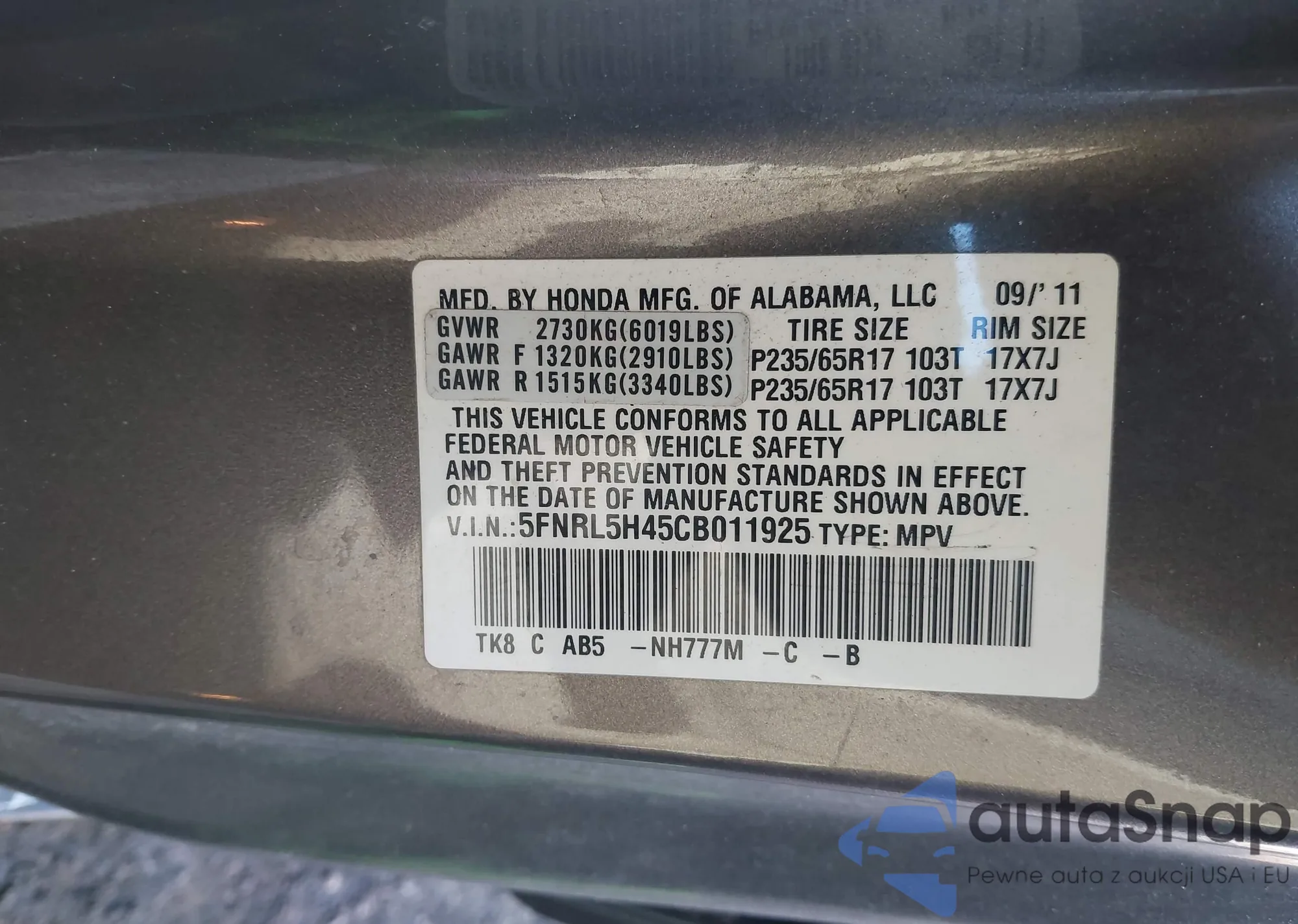 • VIN: 5FNRL5H45CB011925