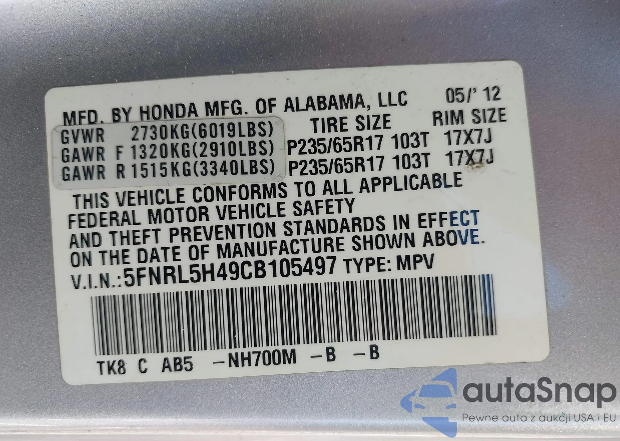 VIN: 5FNRL5H49CB105497
