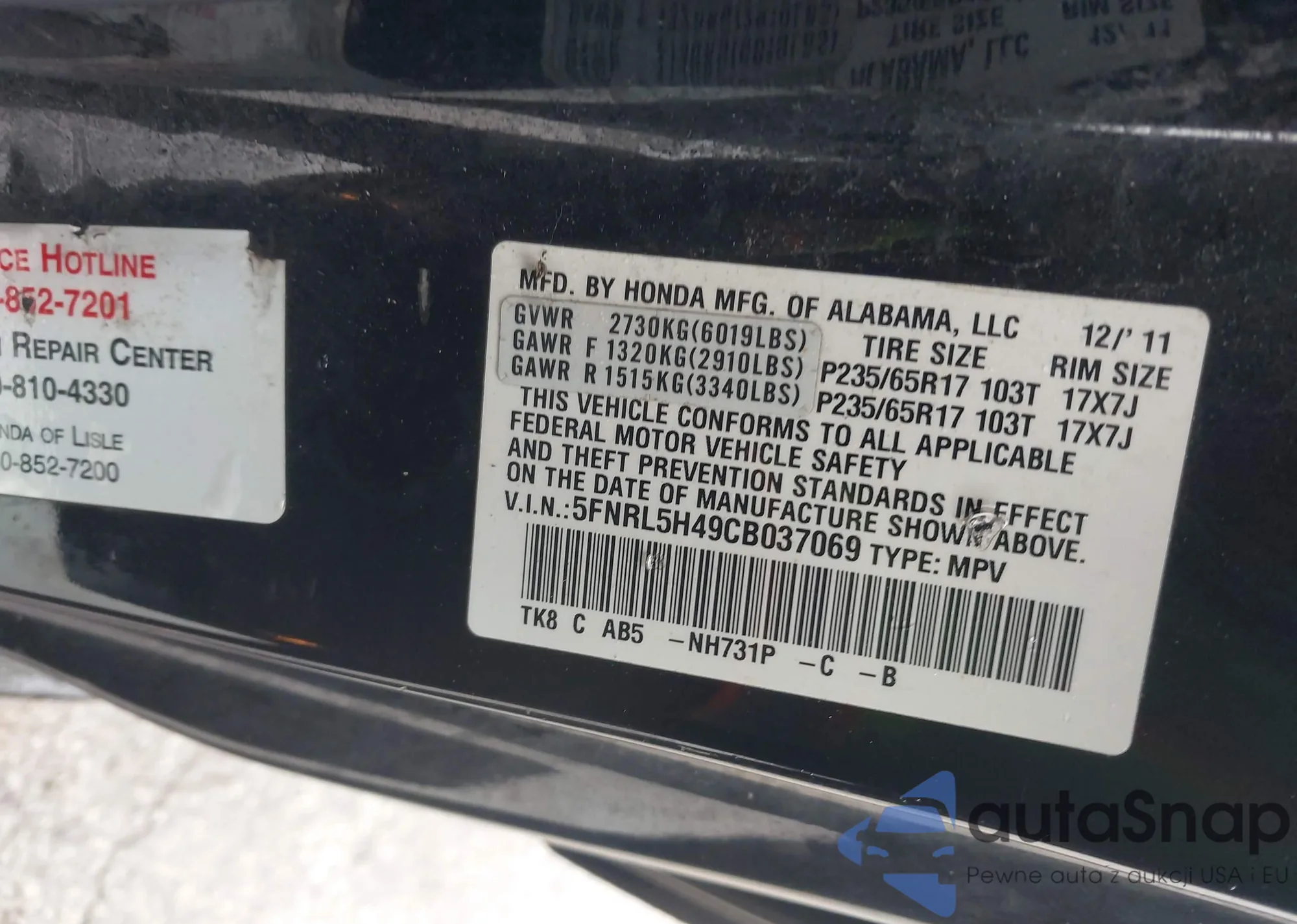 VIN: 5FNRL5H49CB037069
