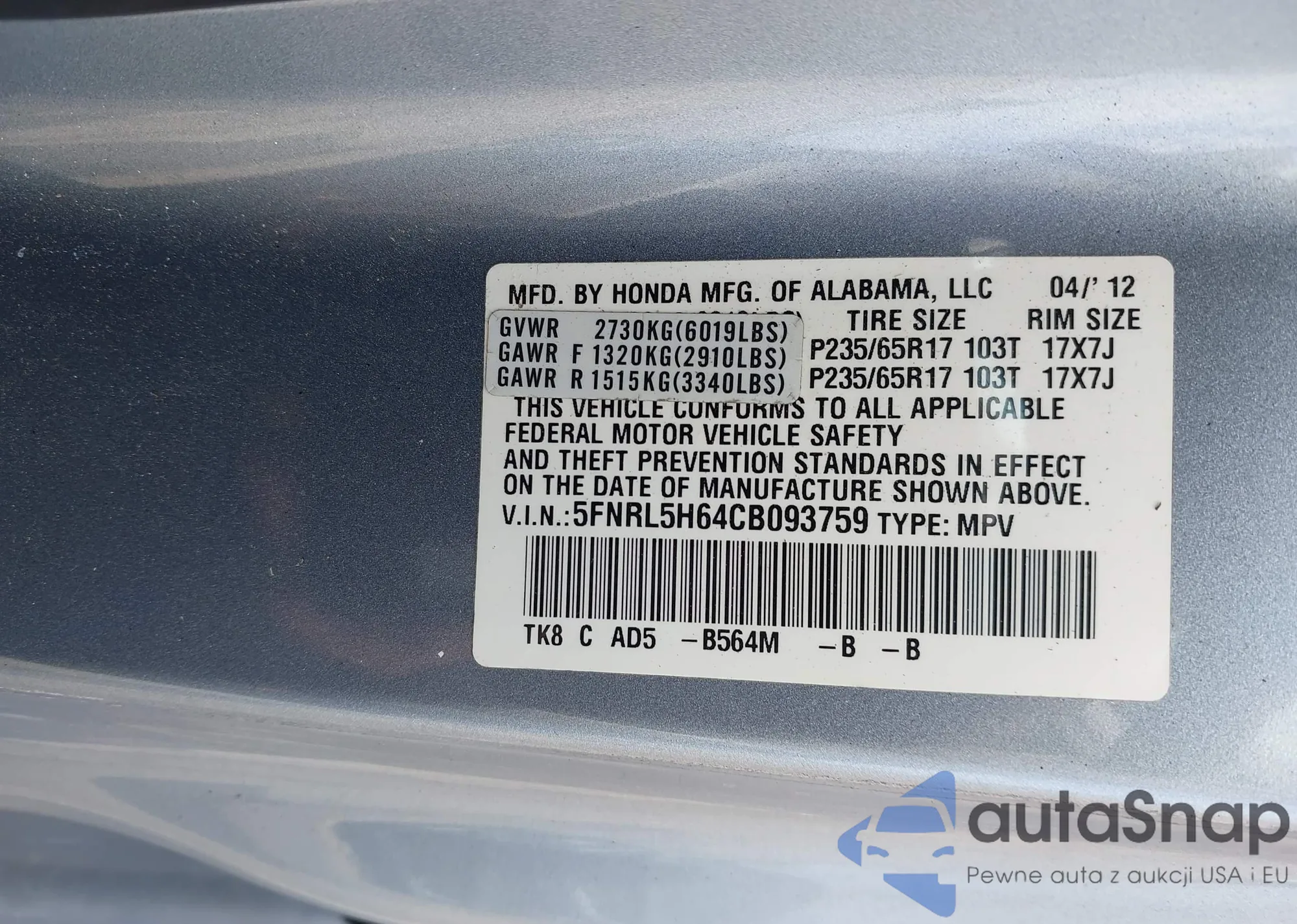 VIN: 5FNRL5H64CB093759