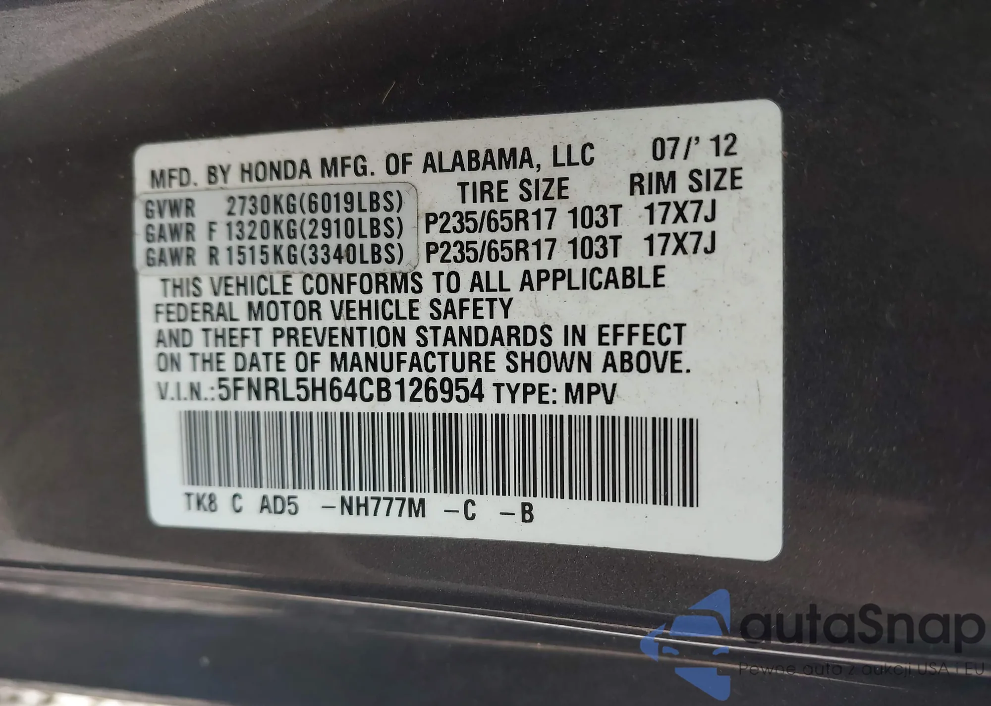 VIN: 5FNRL5H64CB126954