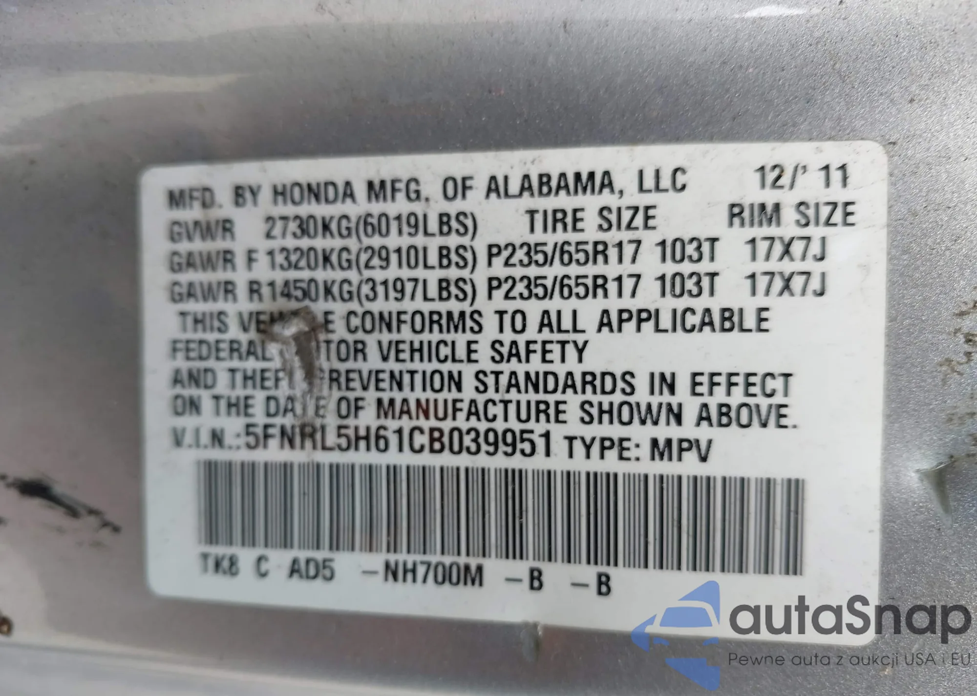 Автомобиль Honda Odyssey 2012 (VIN 5FNRL5H61CB039951) ранее не участвовал в торгах. Документы чистые, пробег соответствует или ниже среднего по рынку. Продаётся страховой компанией — рекомендуем покупку. Доставка в порт займет около 6–8 недель.