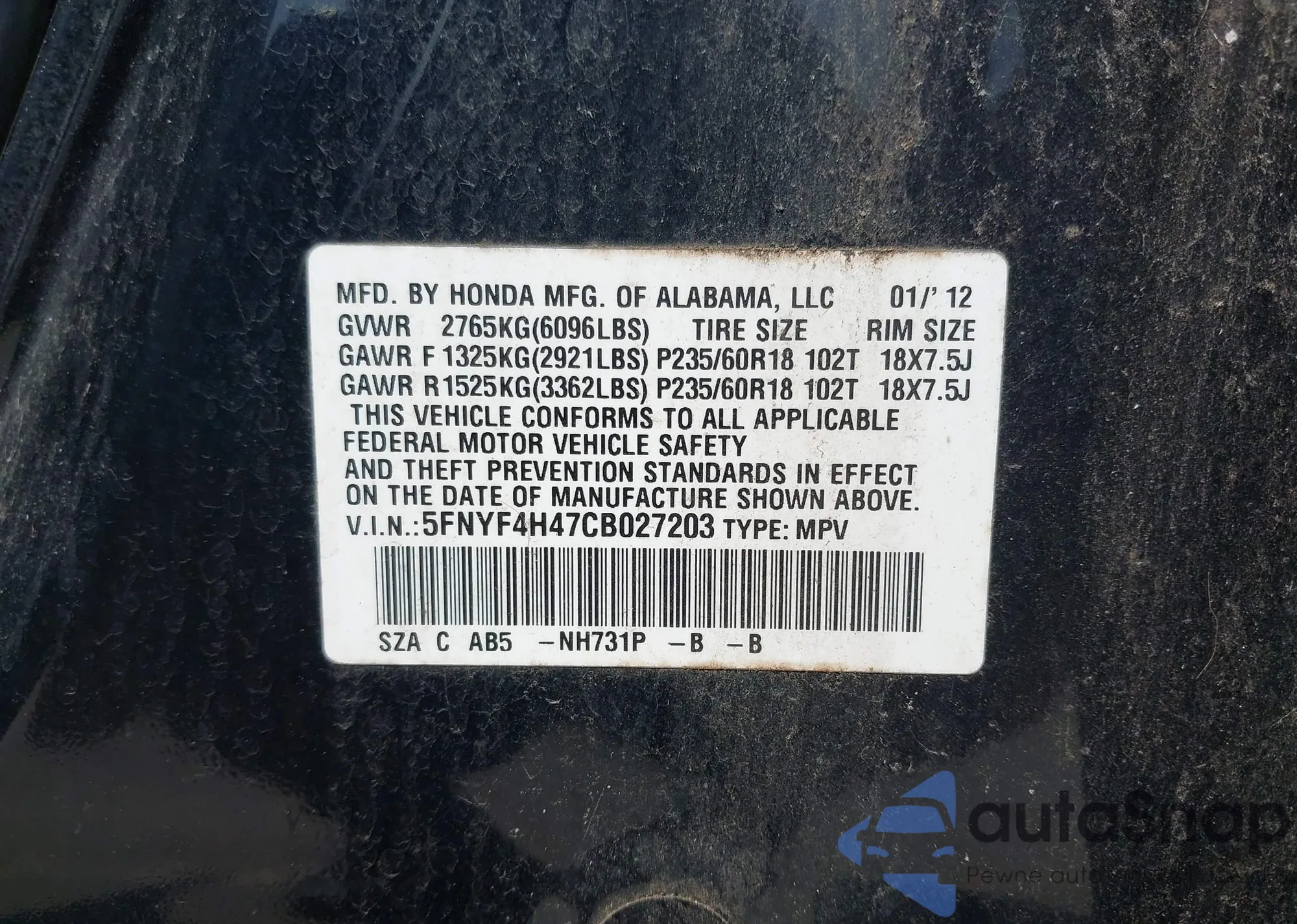 VIN: 5FNYF4H47CB027203