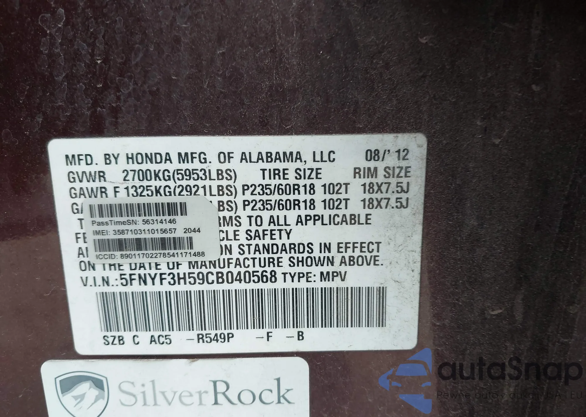 VIN: 5FNYF3H59CB040568