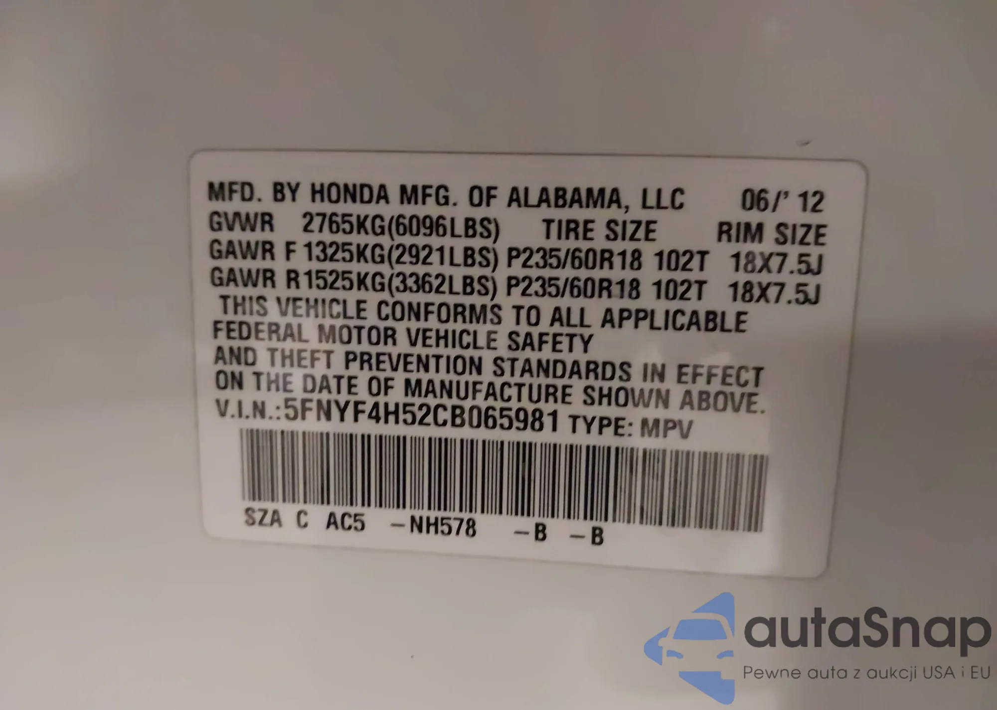 VIN: 5FNYF4H52CB065981
