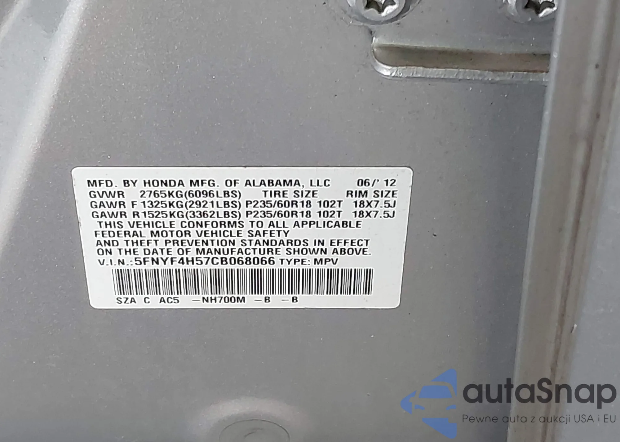 VIN: 5FNYF4H57CB068066