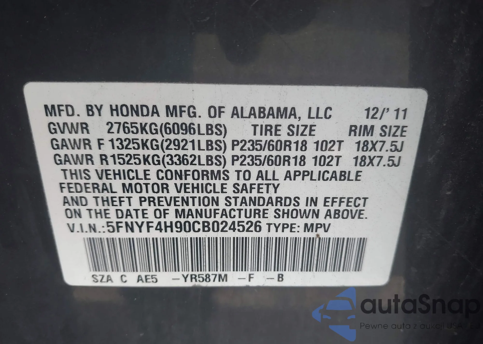 VIN: 5FNYF4H90CB024526