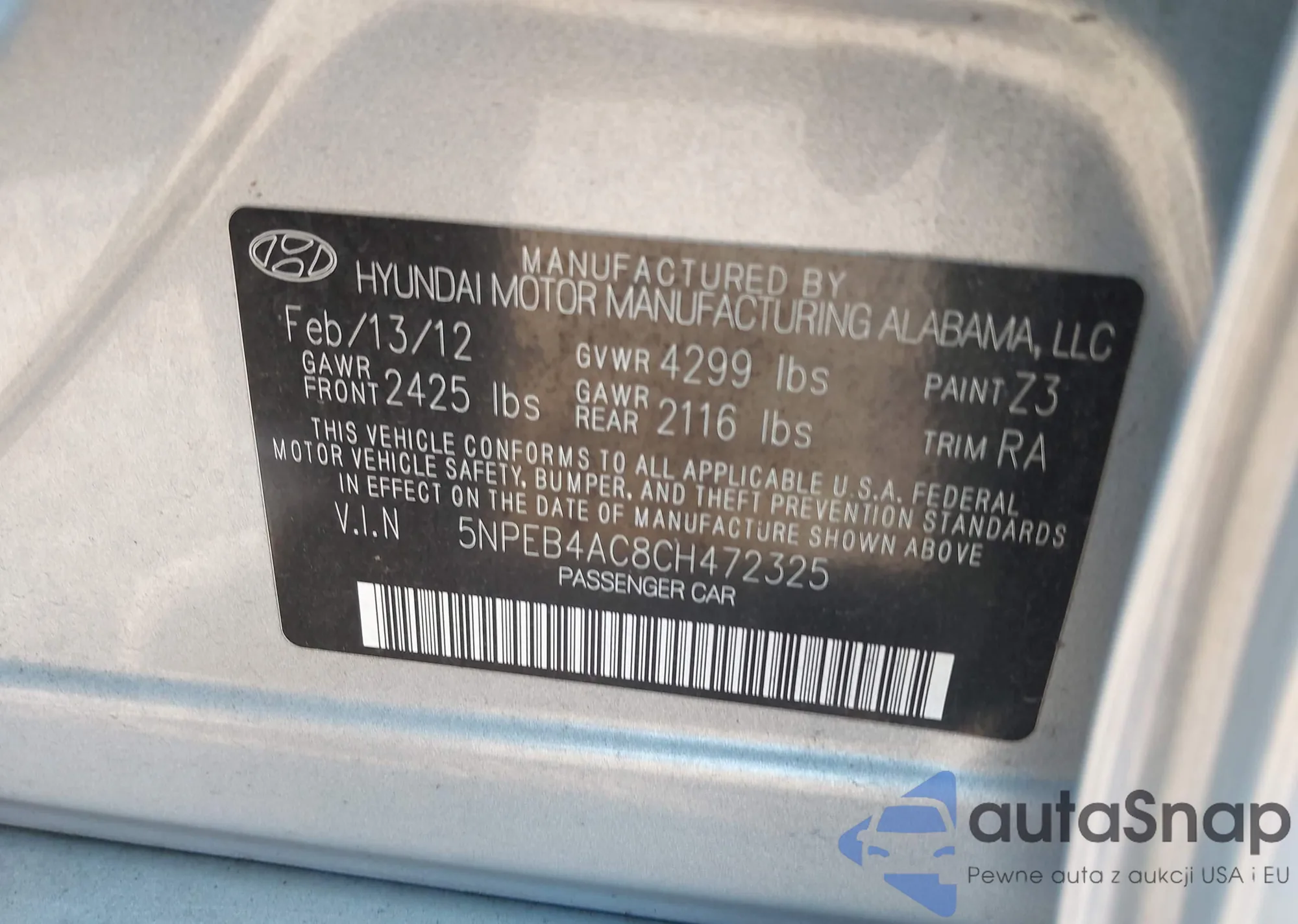 Автомобиль Hyundai Sonata 2012 (VIN 5NPEB4AC8CH472325) ранее не участвовал в торгах. Документы чистые, пробег соответствует или ниже среднего по рынку. Продаётся страховой компанией — рекомендуем покупку. Доставка в порт займет около 6–8 недель.