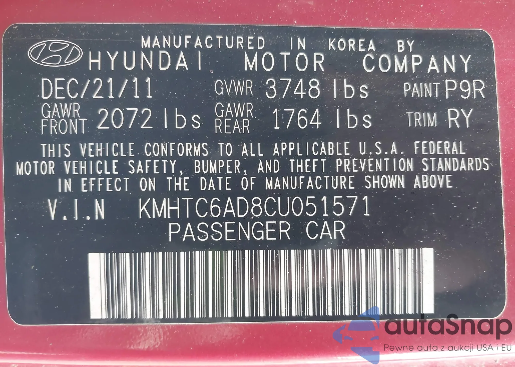 • VIN: KMHTC6AD8CU051571