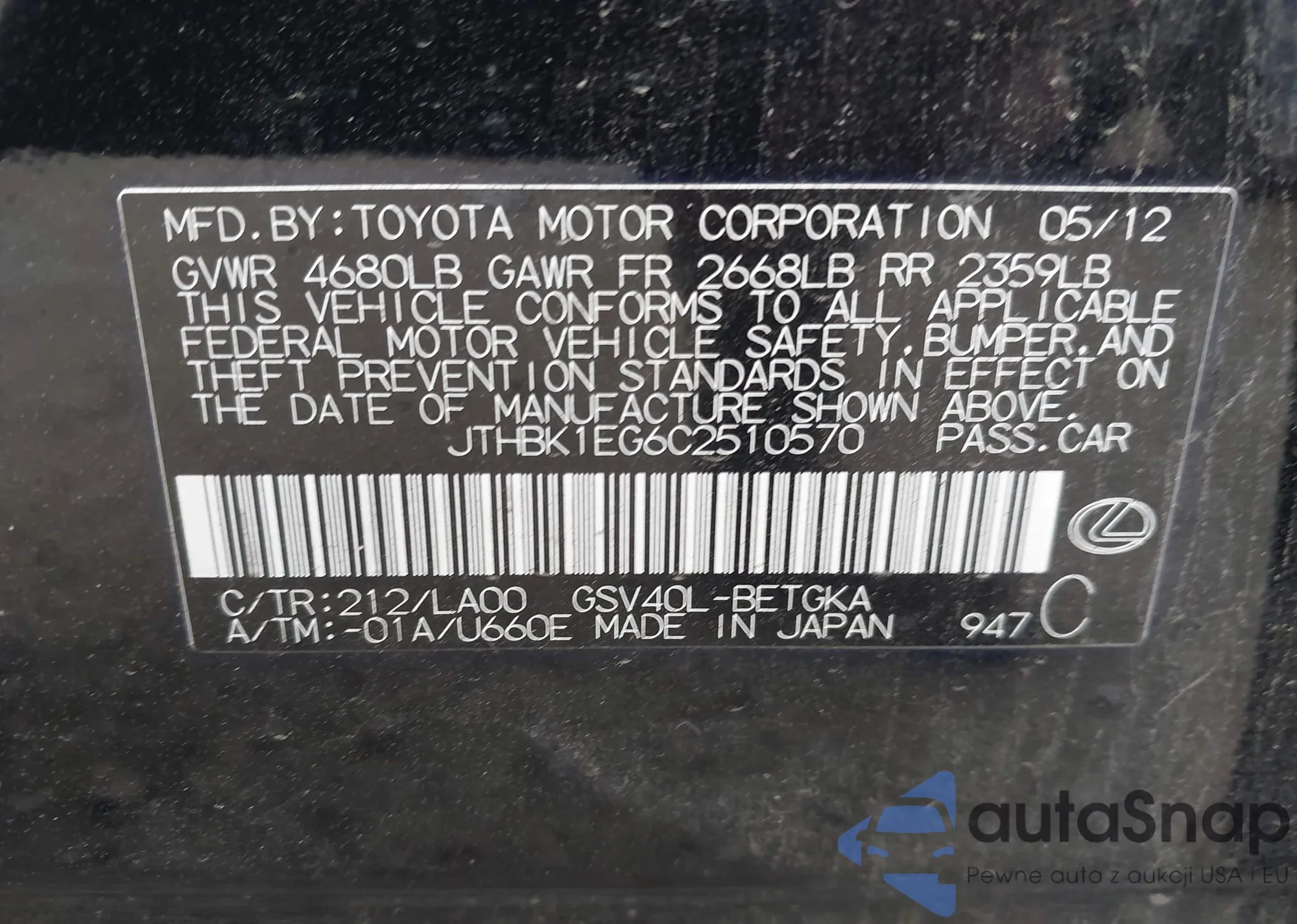 Автомобиль Lexus ES 2012 (VIN JTHBK1EG6C2510570) ранее не участвовал в торгах. Документы чистые, пробег соответствует или ниже среднего по рынку. Продаётся страховой компанией — рекомендуем покупку. Доставка в порт займет около 6–8 недель.