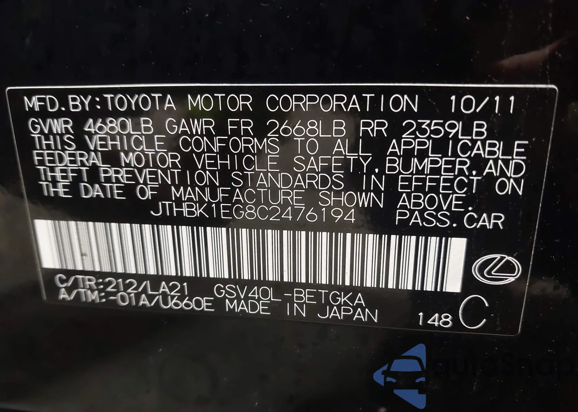 VIN: JTHBK1EG8C2476194