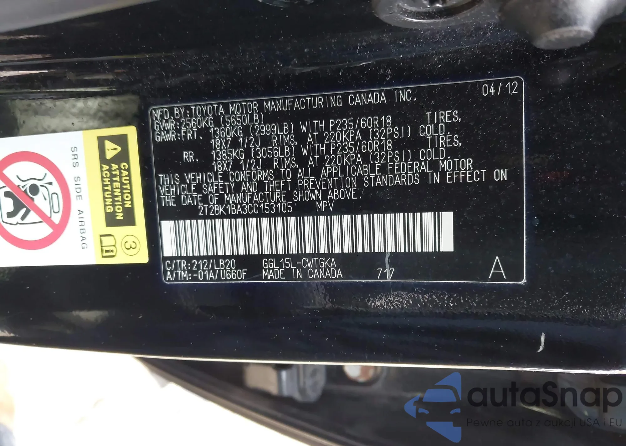 VIN: 2T2BK1BA3CC153105