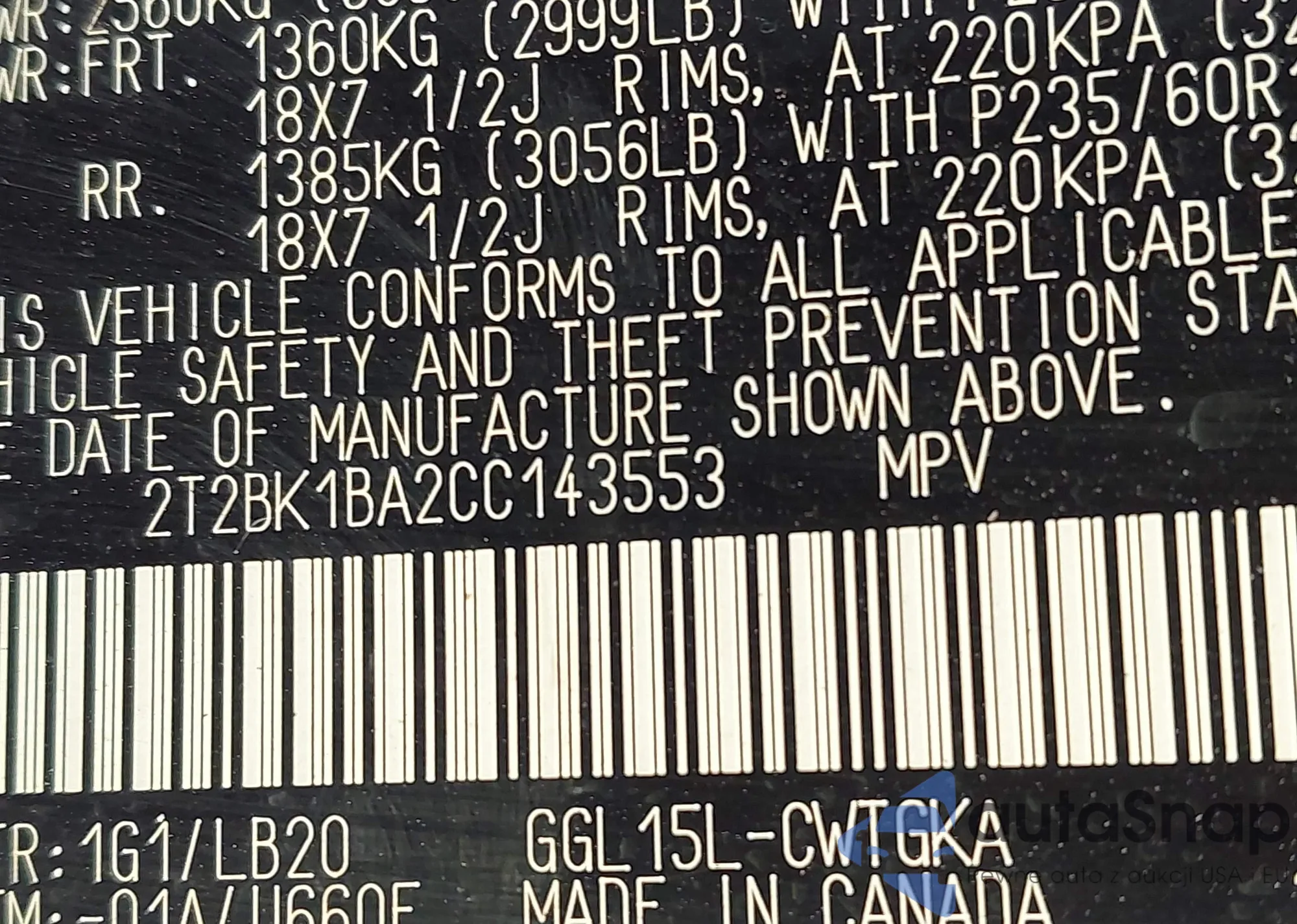 VIN: 2T2BK1BA2CC143553