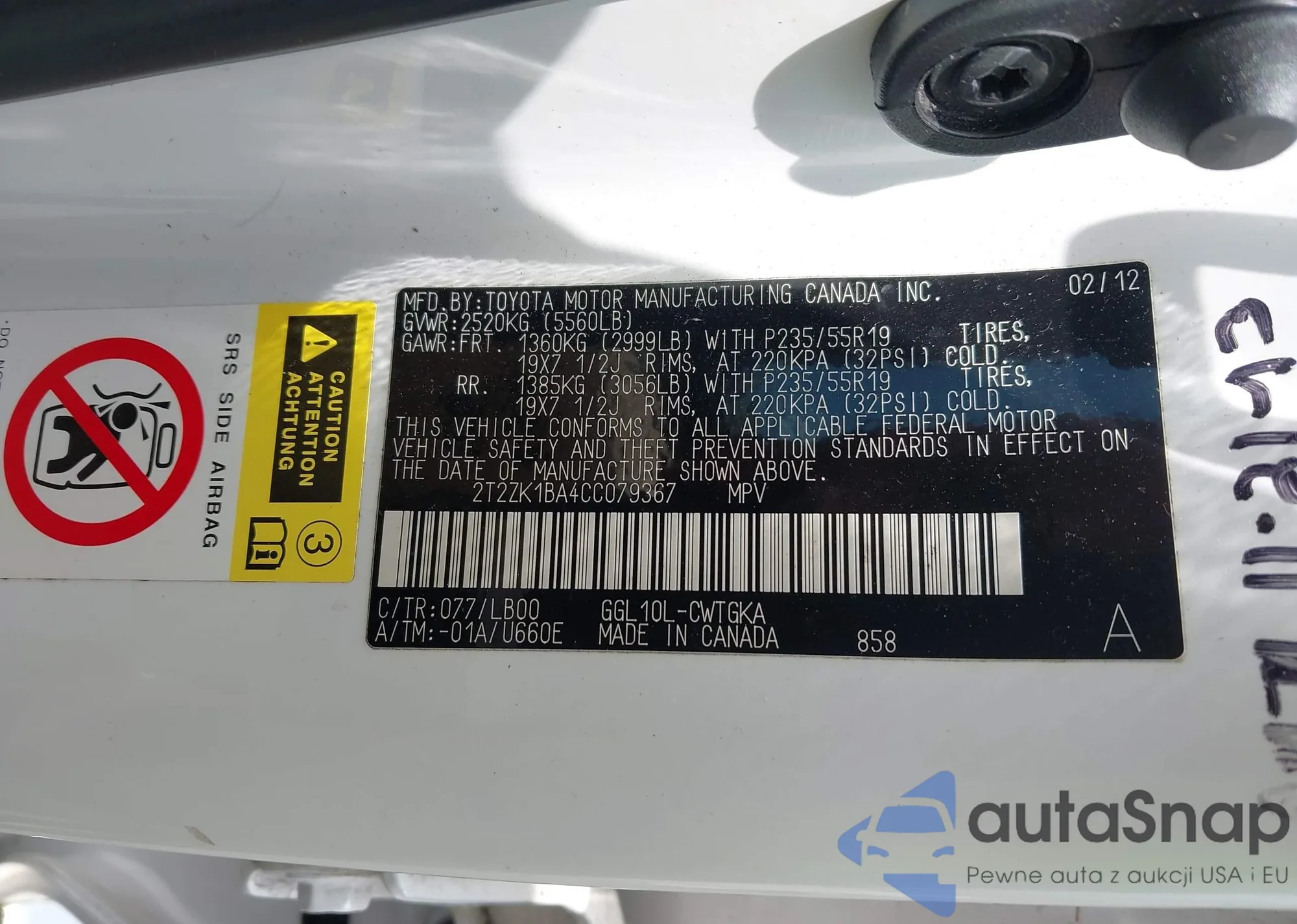 VIN: 2T2ZK1BA4CC079367
