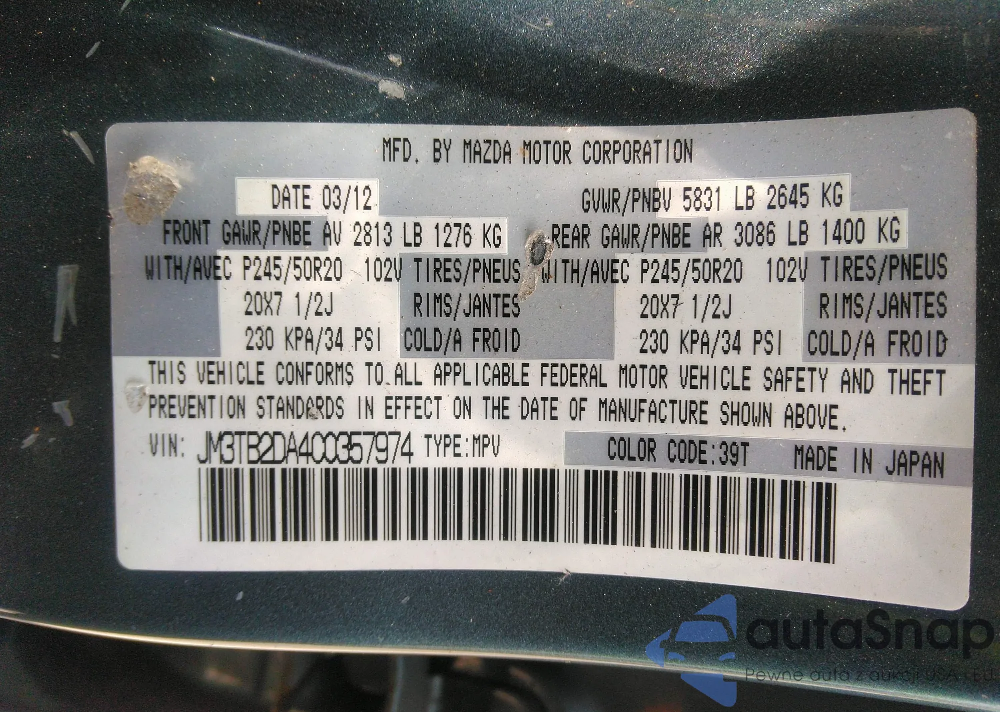 Автомобиль Mazda CX-9 2012 (VIN JM3TB2DA4C0357974) ранее не участвовал в торгах. Документы чистые, пробег соответствует или ниже среднего по рынку. Продаётся страховой компанией — рекомендуем покупку. Доставка в порт займет около 6–8 недель.
