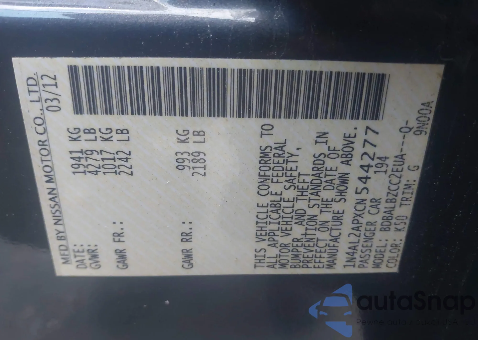 VIN: 1N4AL2APXCN544277