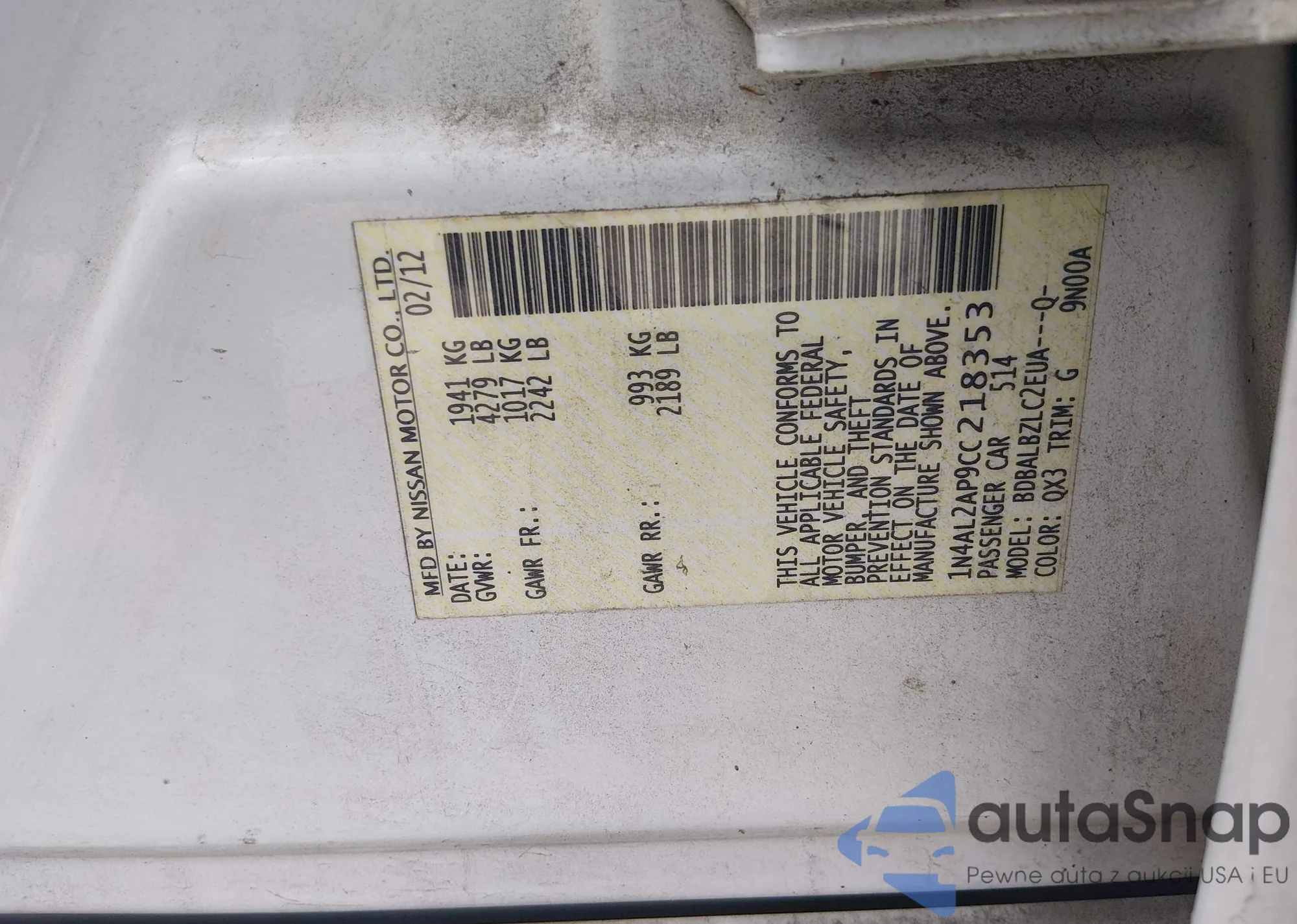 Автомобиль Nissan Altima 2012 (VIN 1N4AL2AP9CC218353) ранее не участвовал в торгах. Документы чистые, пробег соответствует или ниже среднего по рынку. Продаётся страховой компанией — рекомендуем покупку. Доставка в порт займет около 6–8 недель.
