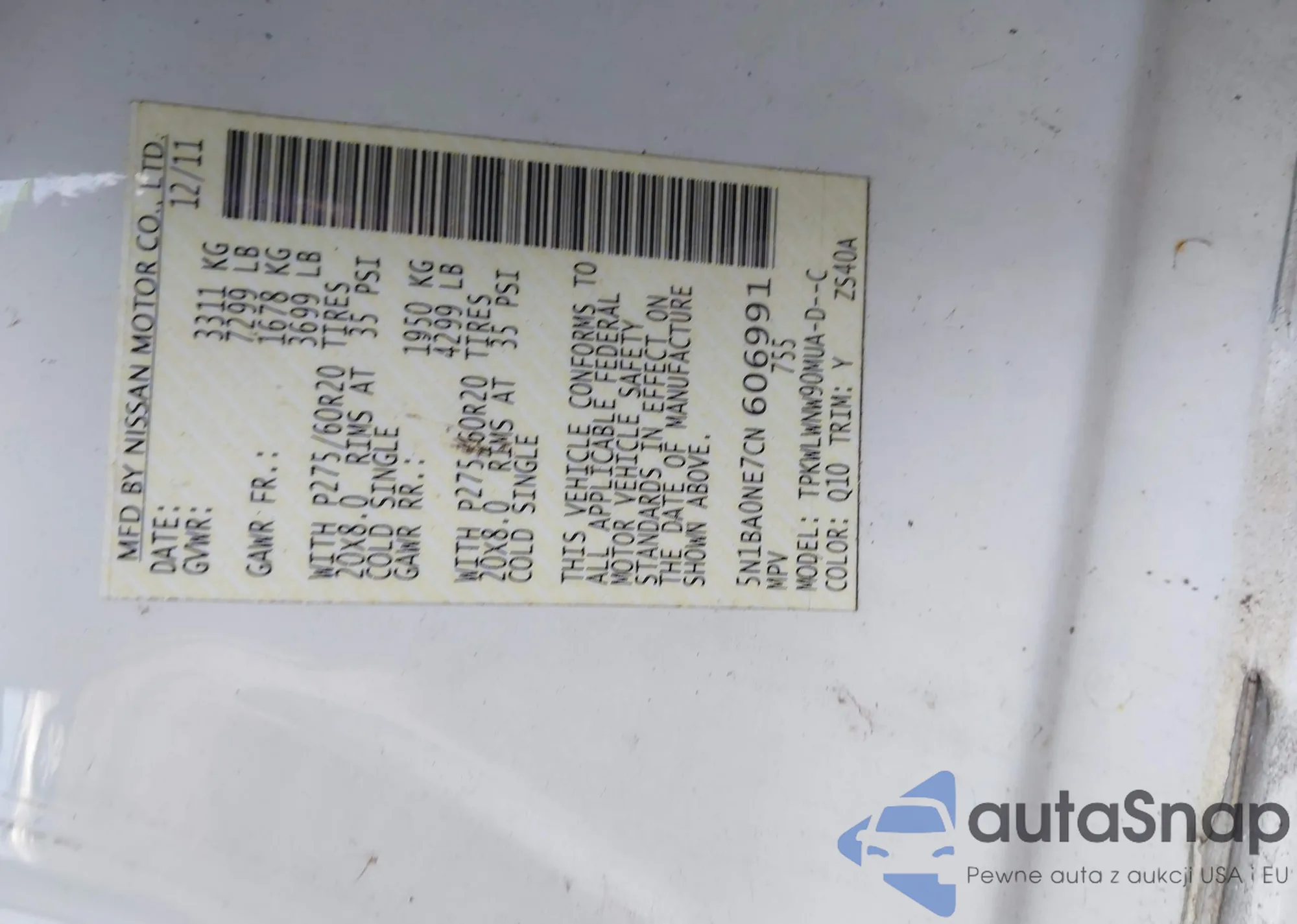 Автомобиль Nissan Armada 2012 (VIN 5N1BA0NE7CN606991) продаётся непроверенным продавцом. Рекомендуем проверить отчет Carfax и подтвердить возможность регистрации перед покупкой.