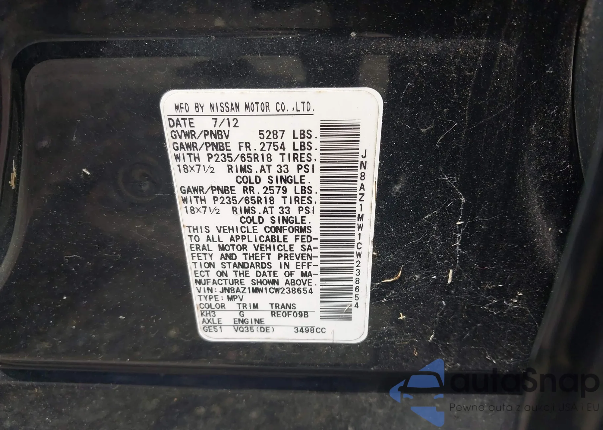 VIN: JN8AZ1MW1CW238654