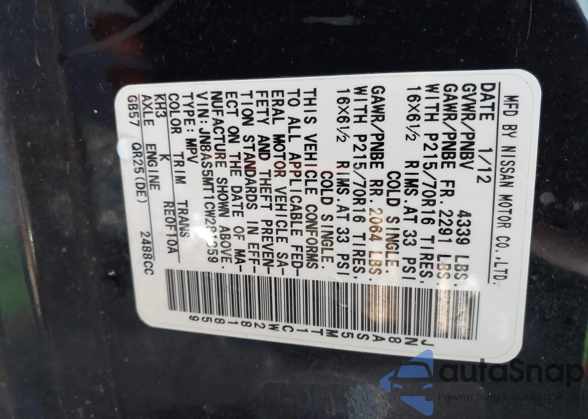• VIN: JN8AS5MT1CW281859