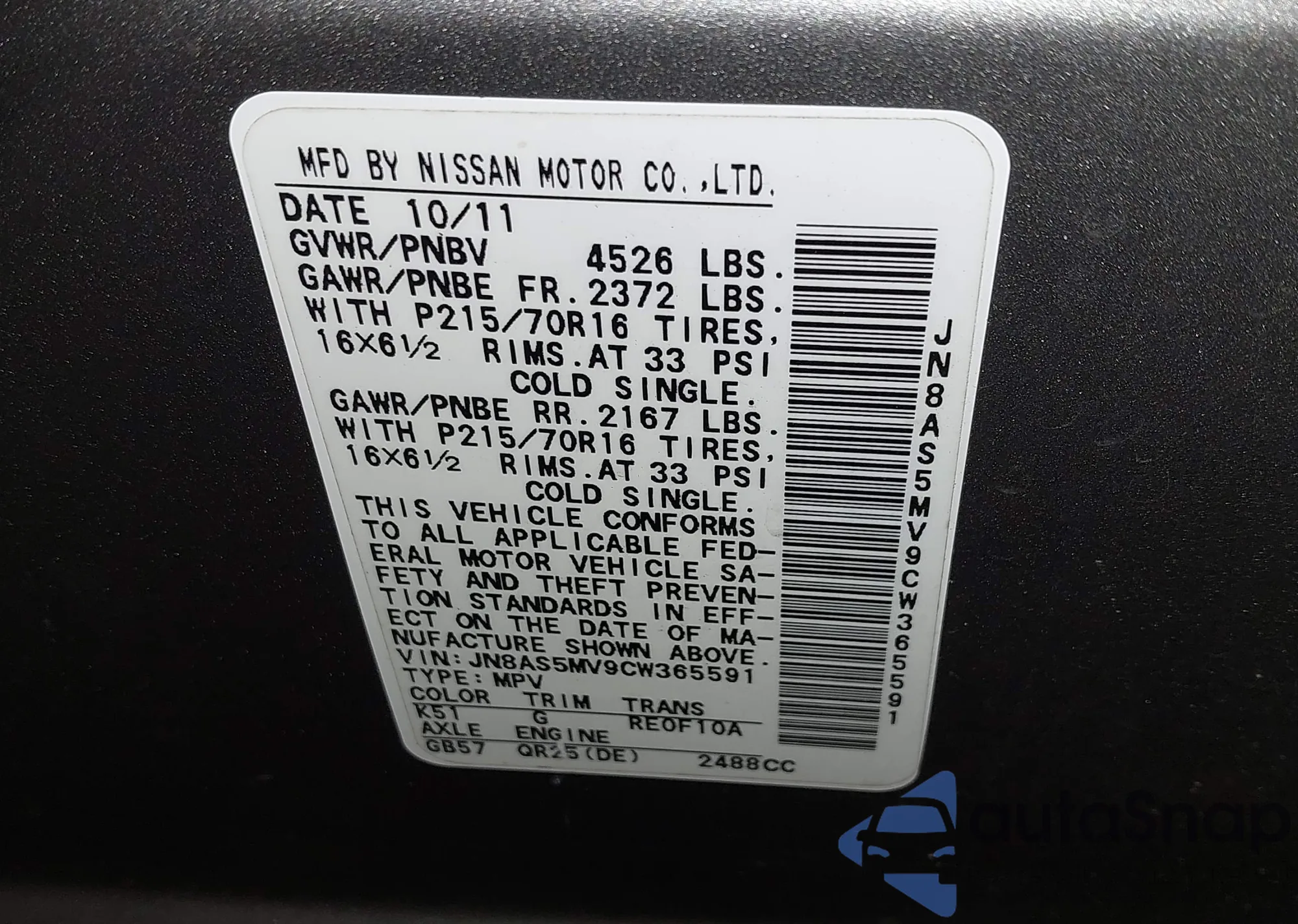 VIN: JN8AS5MV9CW365591
