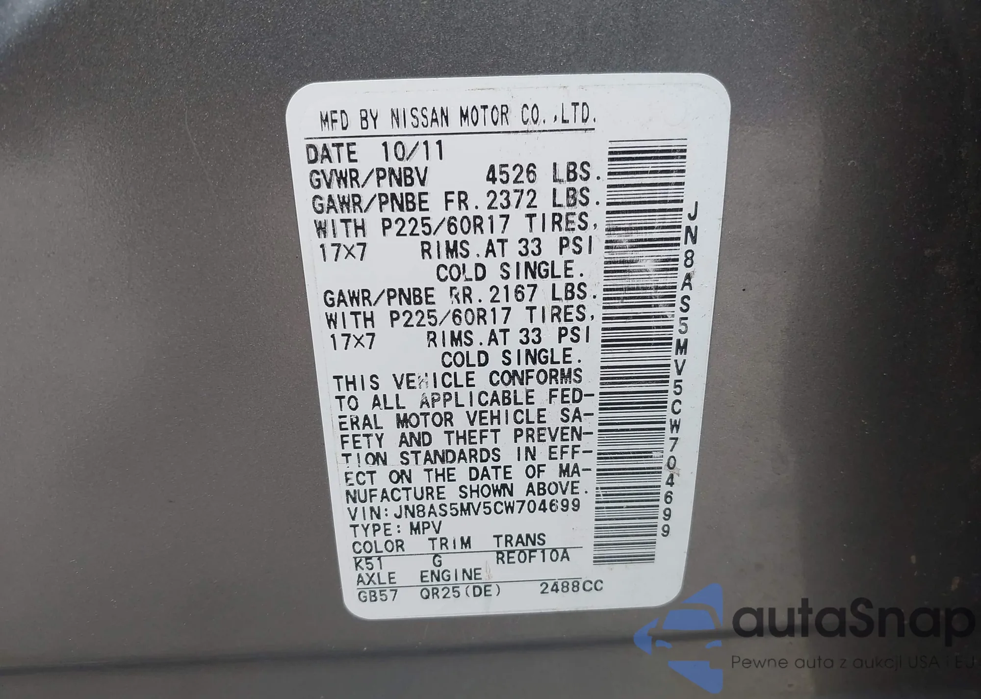 VIN: JN8AS5MV5CW704699