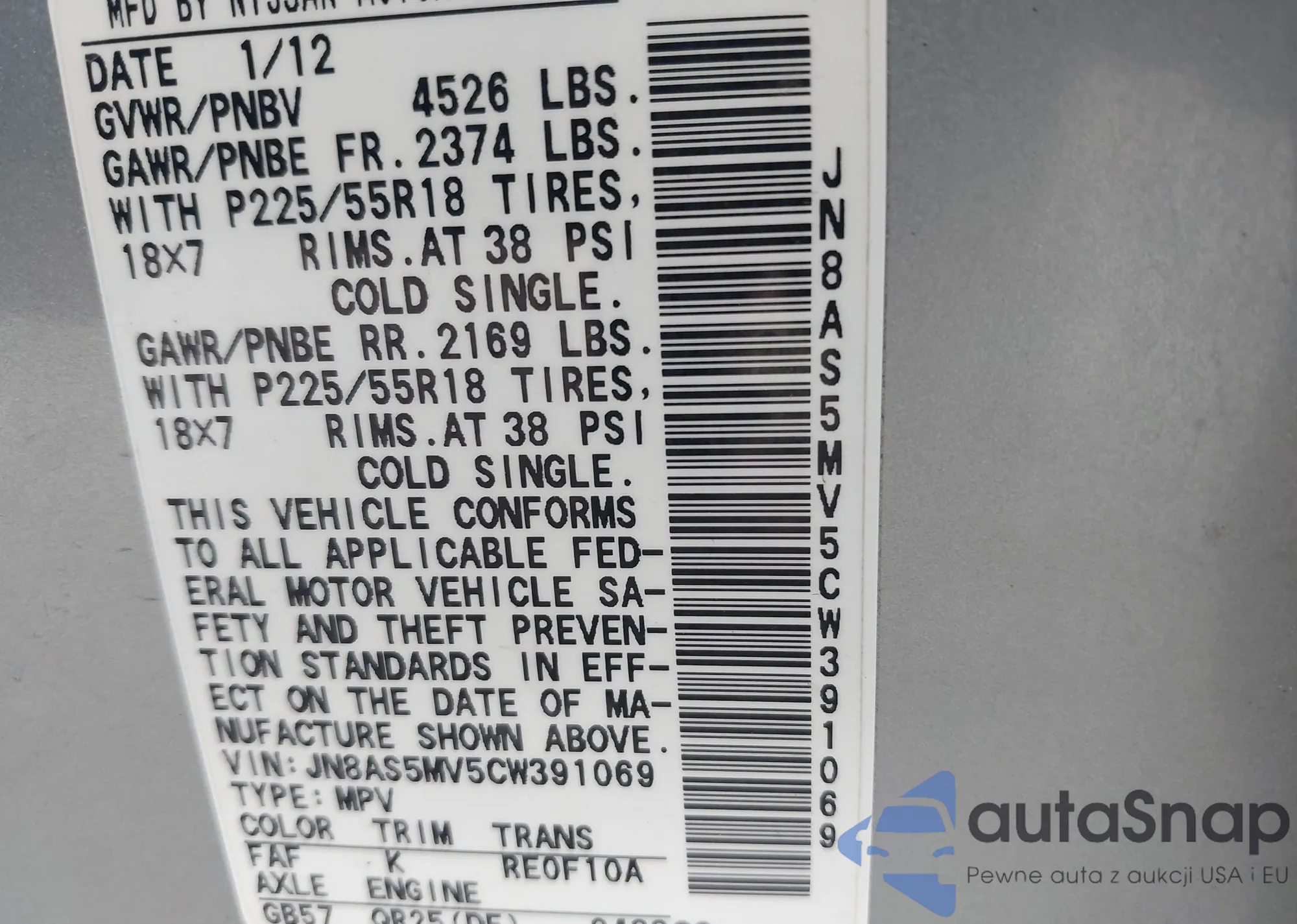 VIN: JN8AS5MV5CW391069