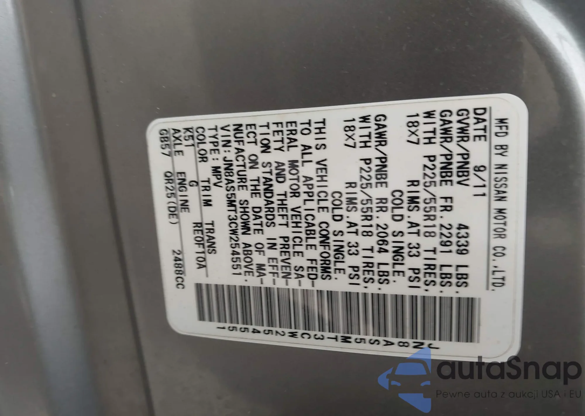 • VIN: JN8AS5MT3CW254551