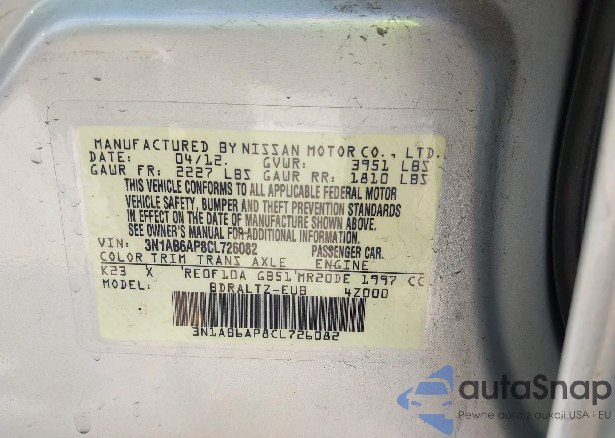 Автомобиль Nissan Sentra 2012 (VIN 3N1AB6AP8CL726082) ранее не участвовал в торгах. Документы чистые, пробег соответствует или ниже среднего по рынку. Продаётся страховой компанией — рекомендуем покупку. Доставка в порт займет около 6–8 недель.