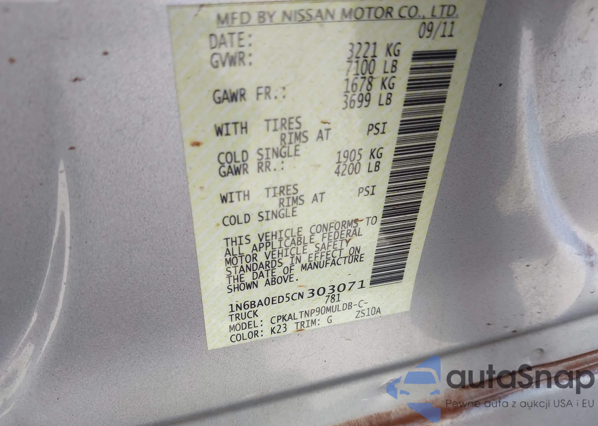 Автомобиль Nissan Titan 2012 (VIN 1N6BA0ED5CN303071) ранее не участвовал в торгах. Документы чистые, пробег соответствует или ниже среднего по рынку. Продаётся страховой компанией — рекомендуем покупку. Доставка в порт займет около 6–8 недель.