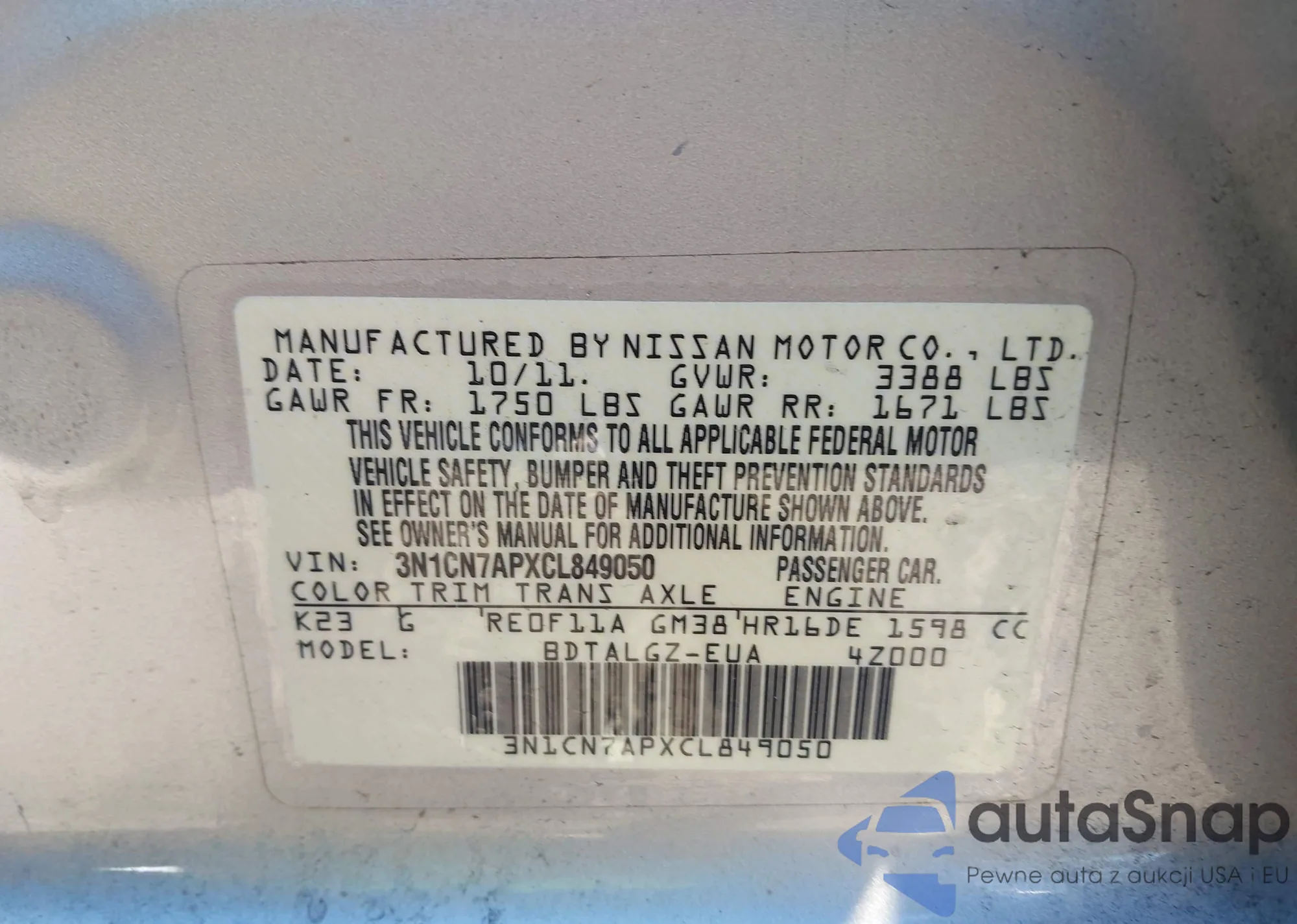 Автомобиль Nissan Versa 2012 (VIN 3N1CN7APXCL849050) ранее не участвовал в торгах. Документы чистые, пробег соответствует или ниже среднего по рынку. Продаётся страховой компанией — рекомендуем покупку. Доставка в порт займет около 6–8 недель.