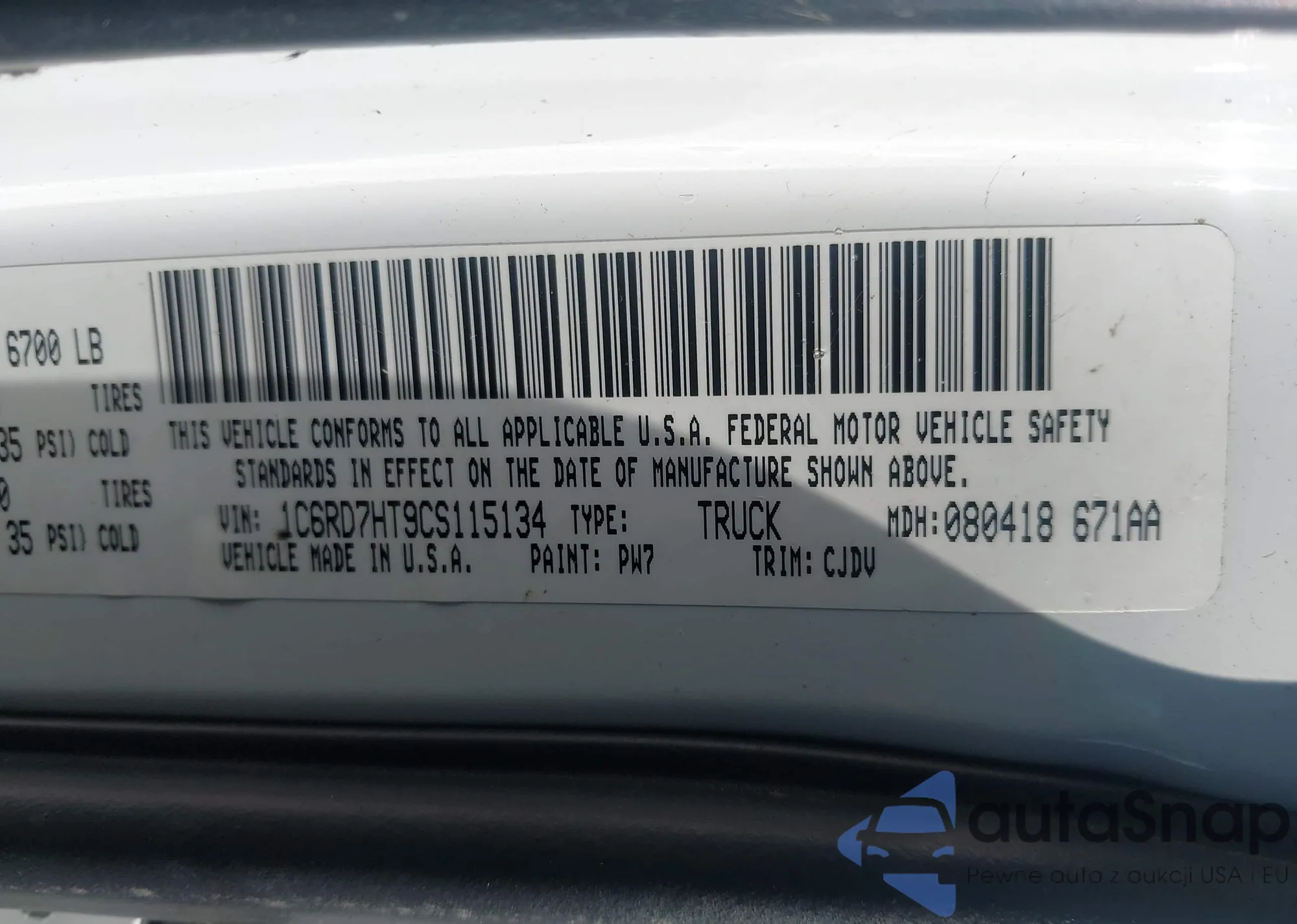 VIN: 1C6RD7HT9CS115134