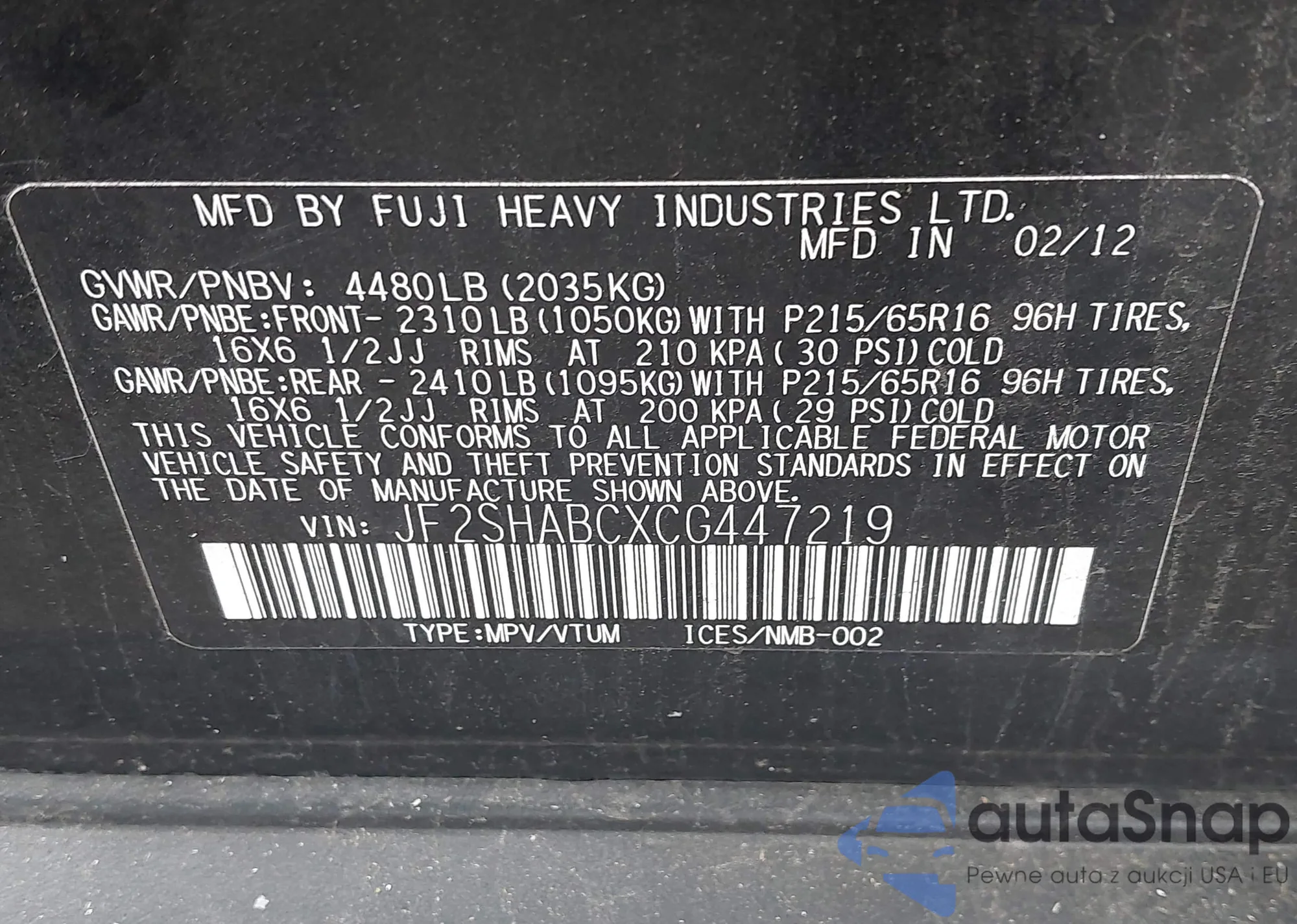 VIN: JF2SHABCXCG447219